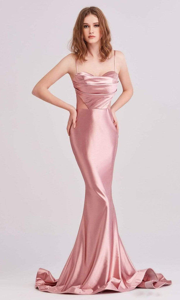 Shimmer and shine in an ethereal dress from Jadore J15031. Shine in this dress as it is made with satin fabric throughout and it uses spaghetti straps on cowl sweetheart neckline. Bodice is fitted and pleated while matching the see-through back style. It parades a figure-flattering trumpet silhouette with a sweep train finish for a memorable walk. Step into the spotlight in this stellar evening gown by Jadore.