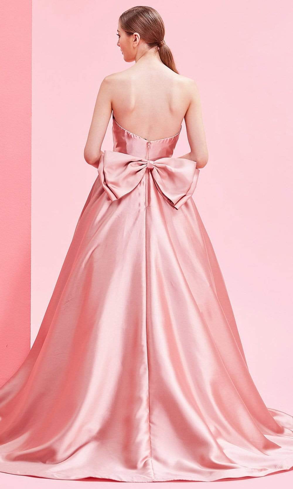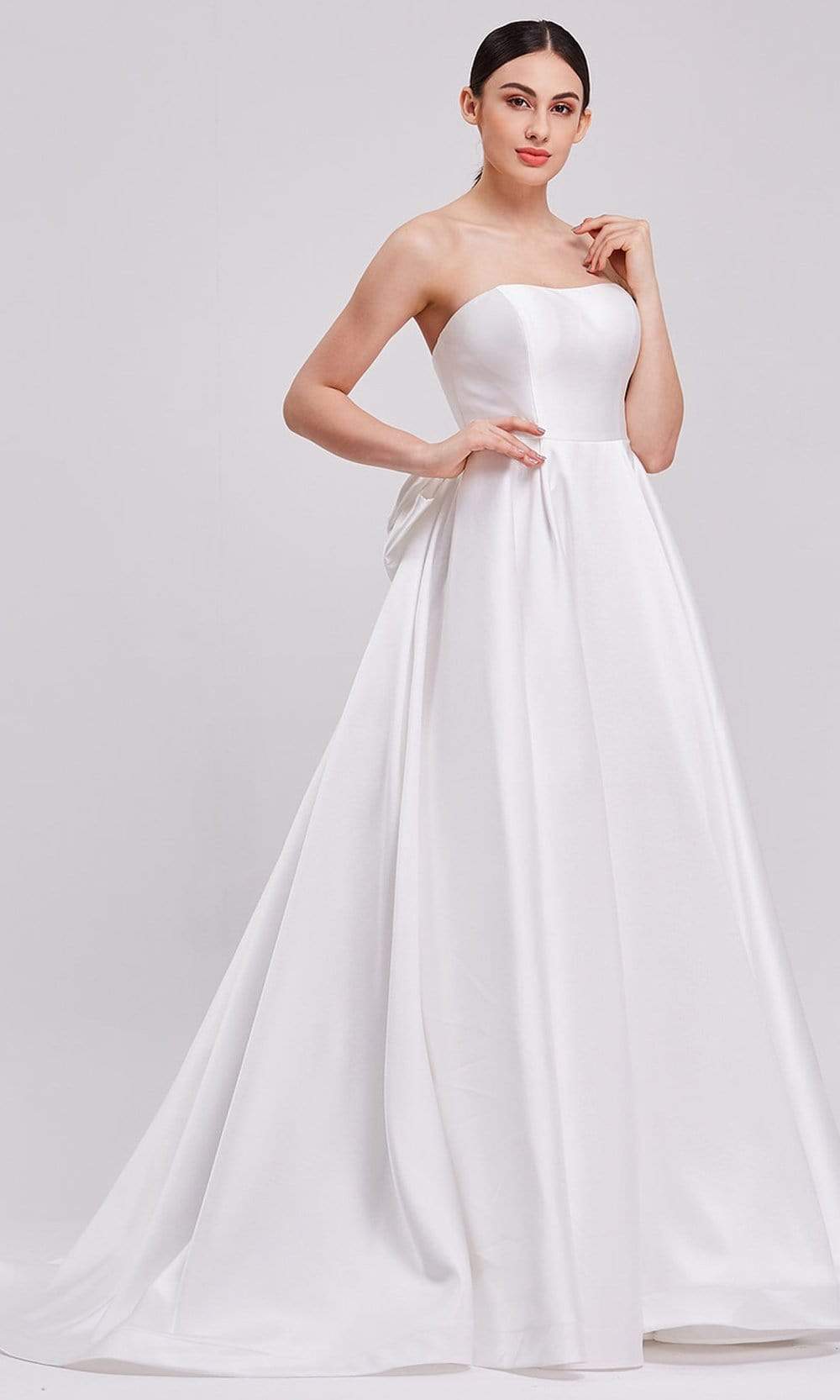 | Details: | Strapless, Box-Pleated Skirt, Oversized Bow Back, Mid-Open Back, Back Zipper Closure, Sweep Train |