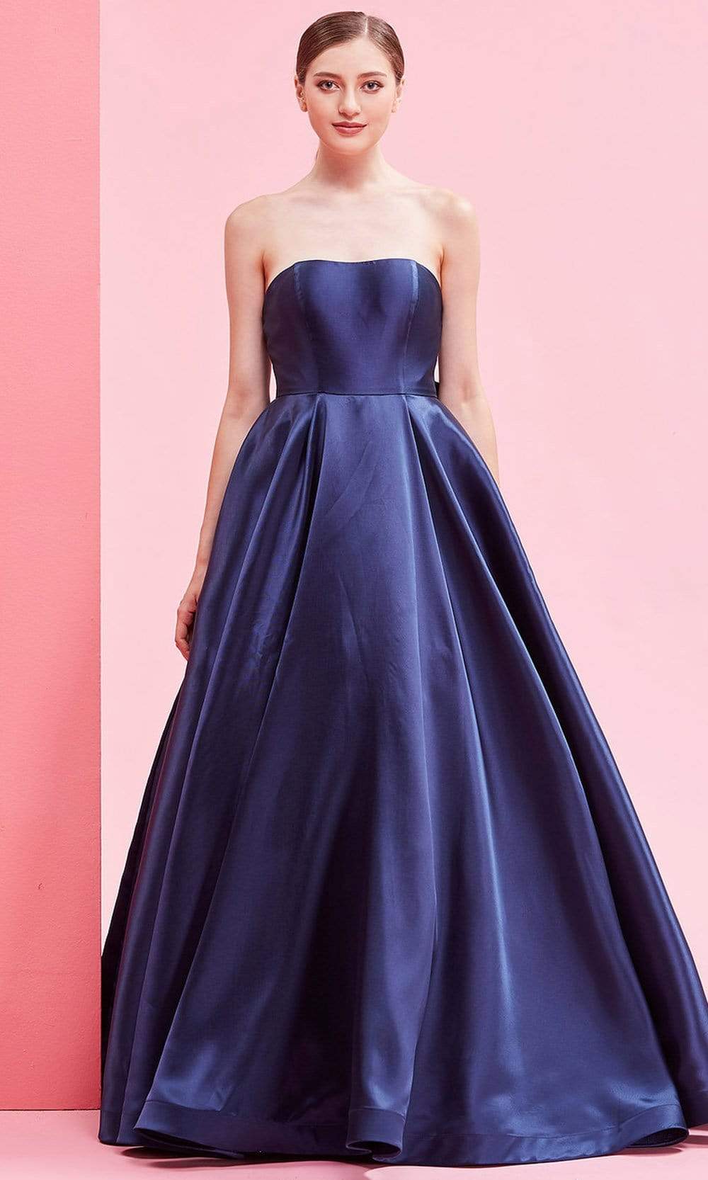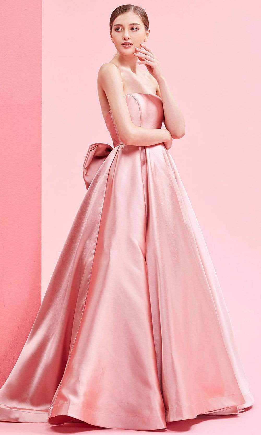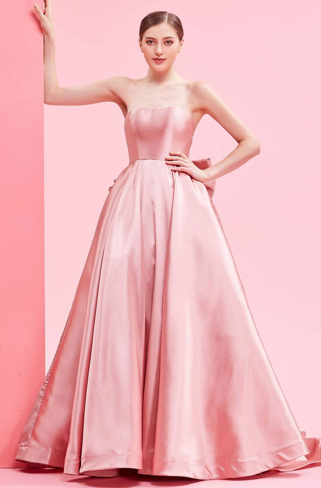 Flaunt a fascinatingly stellar style at your soiree in this J'Adore J16008 creation. Sculpted in a sleek Mikado fabric, this gown flaunts a strapless bodice with a modified sweetheart neckline and a mid-open back. Accented with an oversized bow accent at the back, the A-line skirt cascades in box-pleats as it falls into a luminous length and a sweeping train. Be the very delight of the opulent crowd in this J'Adore masterpiece. Models are wearing the Dusty Pink, Ivory, and Navy colors.