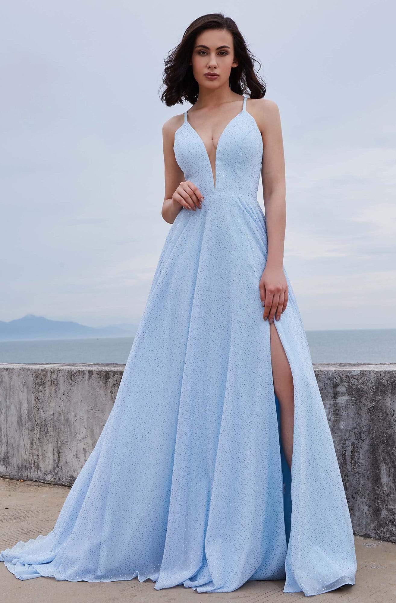 Flatter your figure with this eccentric design by Jadore J16024. This sleeveless stunner graces with a plunging V-neckline with a mesh, accented with stones all over, has an open lace-up back, and a zipper closure. The skirt is tailored in A-line silhouette fashion with a sweep train. Make it a romantic occasion with this Jadore creation.