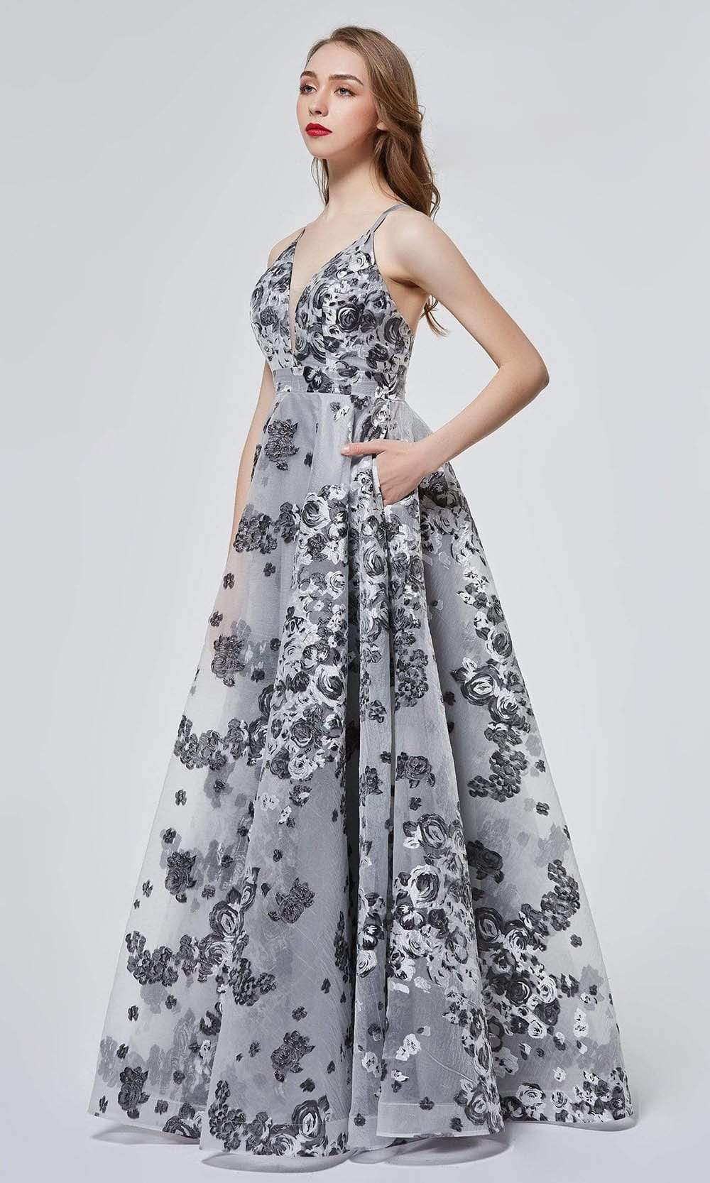 | Details: | Sleeveless, Spaghetti straps, Plunging neckline, Sheer panel, Jacquard, Floral, Metallic, Crisscross, Back zipper, Floor length, Sweep train |