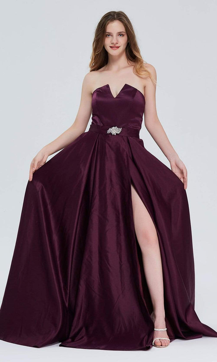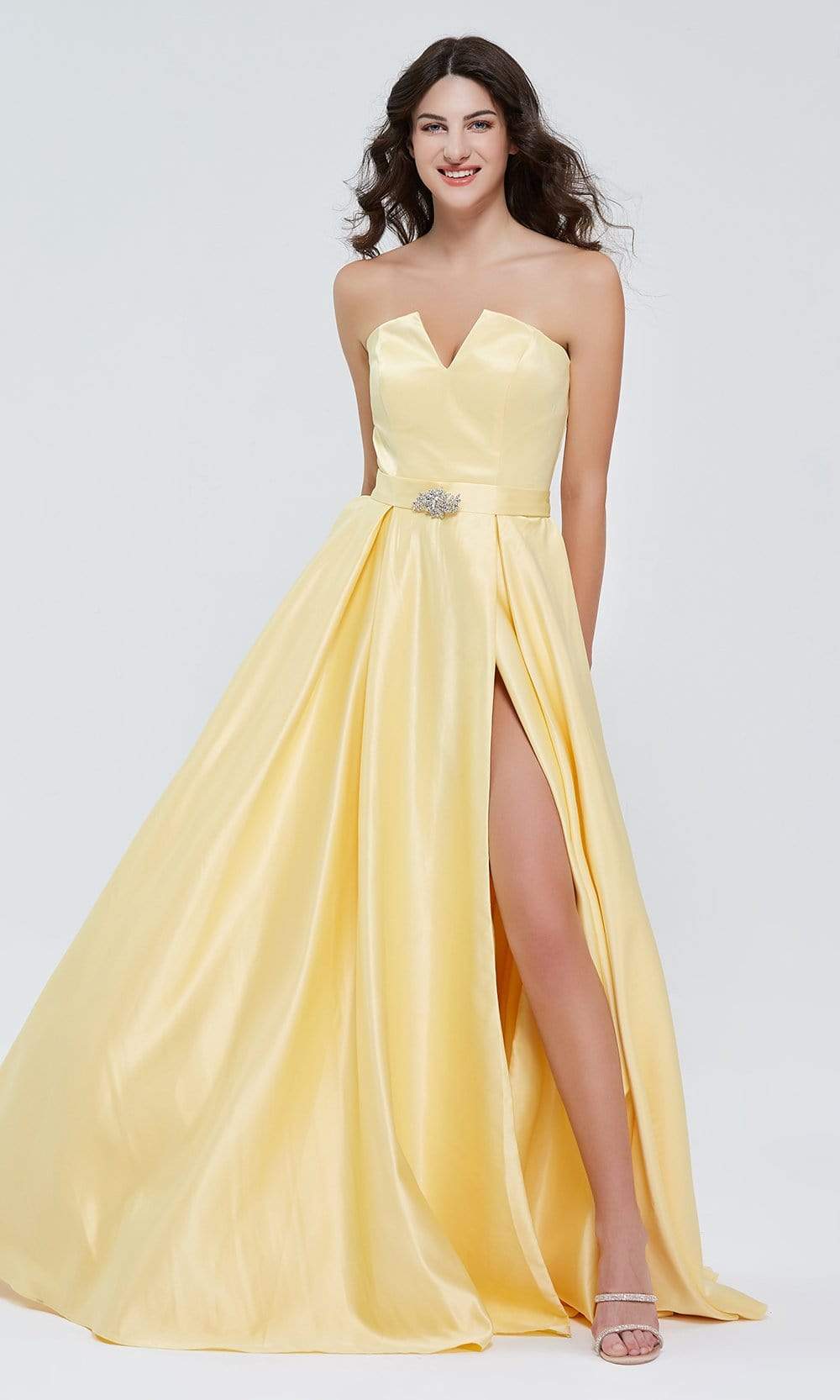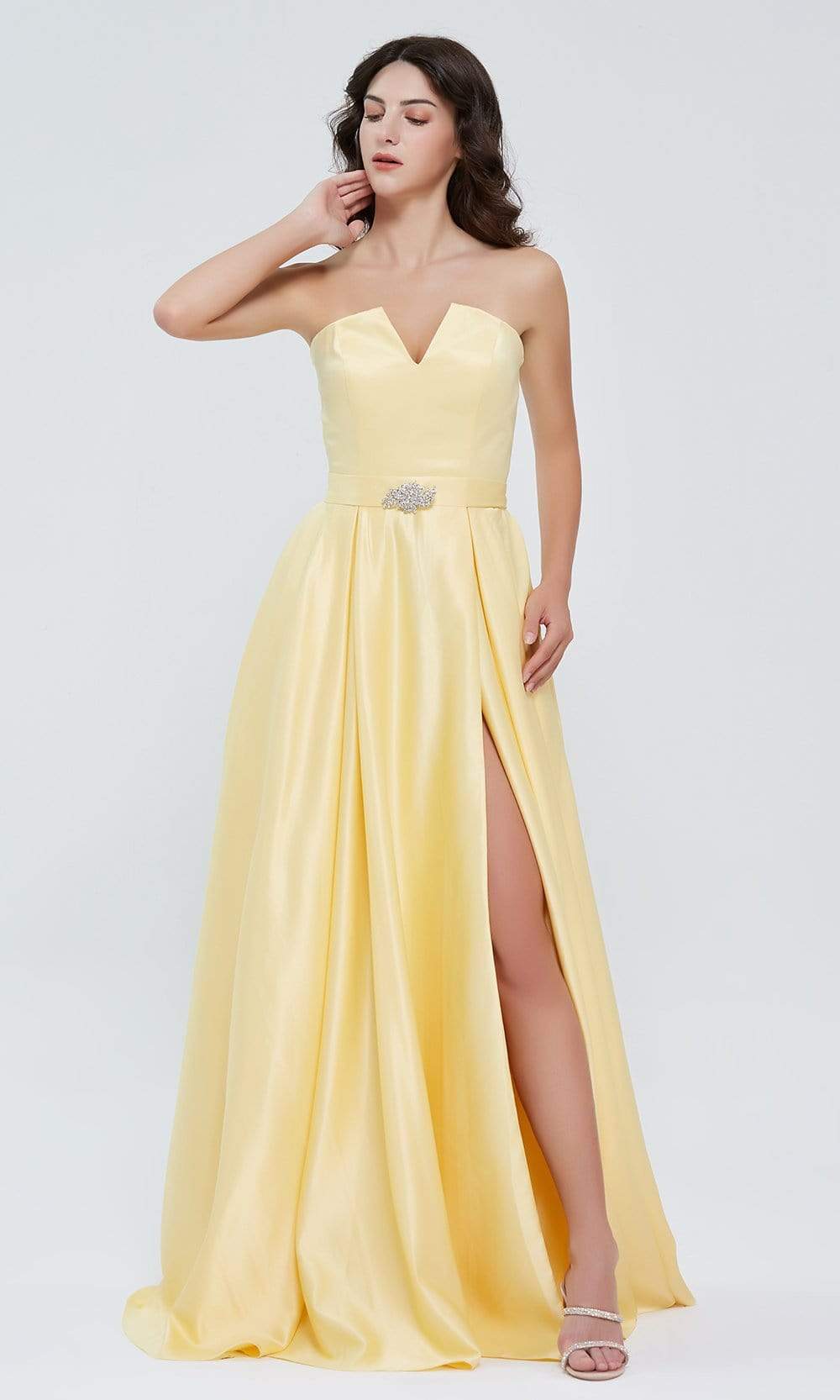 Abound with the charm of old Hollywood in this J'Adore J20002 creation. Tailored in sleek satin silhouette, this gown features a strapless bodice with a v-notch accent. Designed with a shimmering brooch accent, the A-line skirt alluringly cascade with a high slit and a sweep train. Shimmer like a ray of sunbeam in this J'Adore masterpiece.