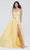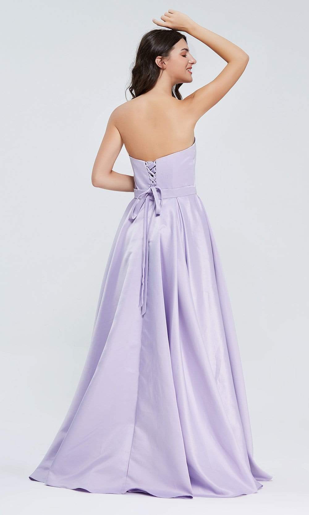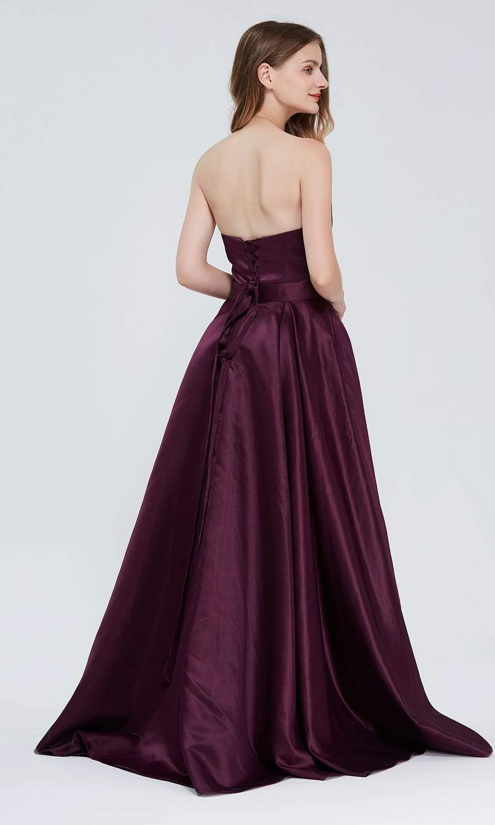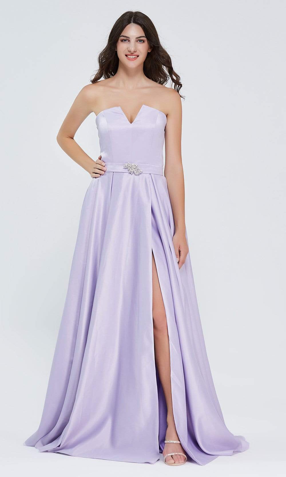 Abound with the charm of old Hollywood in this J'Adore J20002 creation. Tailored in sleek satin silhouette, this gown features a strapless bodice with a v-notch accent. Designed with a shimmering brooch accent, the A-line skirt alluringly cascade with a high slit and a sweep train. Shimmer like a ray of sunbeam in this J'Adore masterpiece.