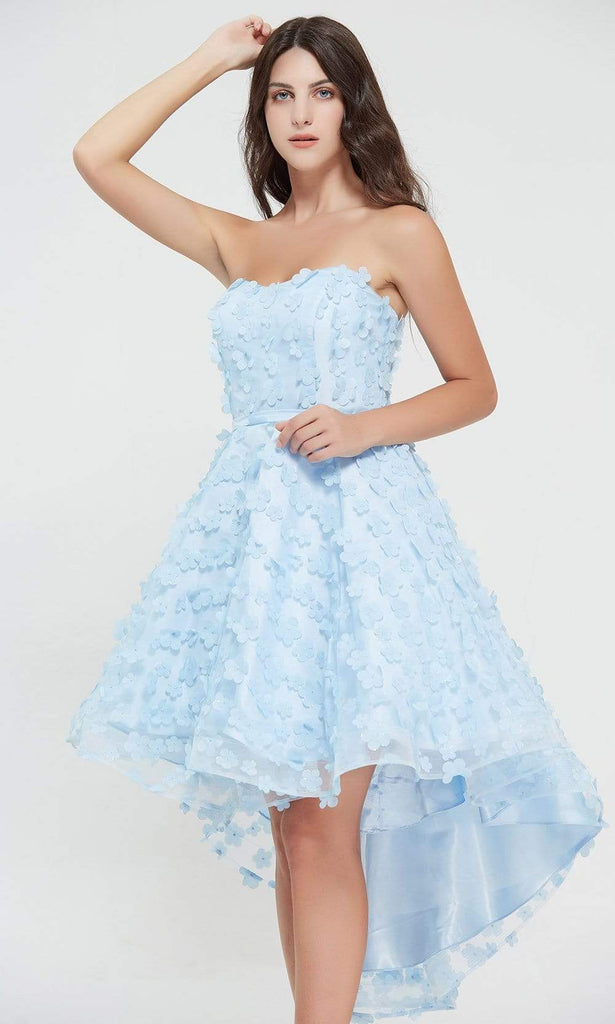 Show off your trendsetting style when you wear this J'Adore J20074 gown. Featuring a trendy high-low skirt, this strapless midi dress has a full A-line silhouette and a sweetheart neckline. A sheer overlay striped with feminine floral appliques adorns this stunning J'Adore masterpiece.