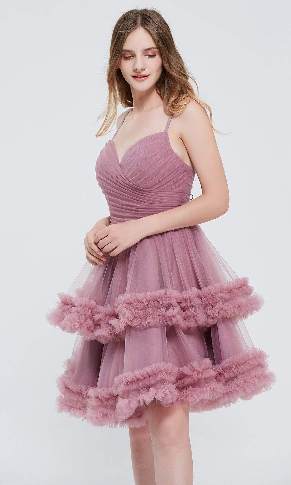 | Details: | Sleeveless, Spaghetti straps, Tulle, Pleats, Tiered, Ruffles, Mid back, Back zipper |