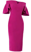 Show off your trendsetting style when you wear this design by Janique 1942. This stretch crepe dress graces in a charming off-shoulder neckline with a V-cut and short bell sleeves. The fitted bodice gives way to a knee length sheath skirt with a center back slit. This Janique look is perfect for a girl who wants the standout style and flawless fit. Dress is pictured in Royal and Fuchsia colors.