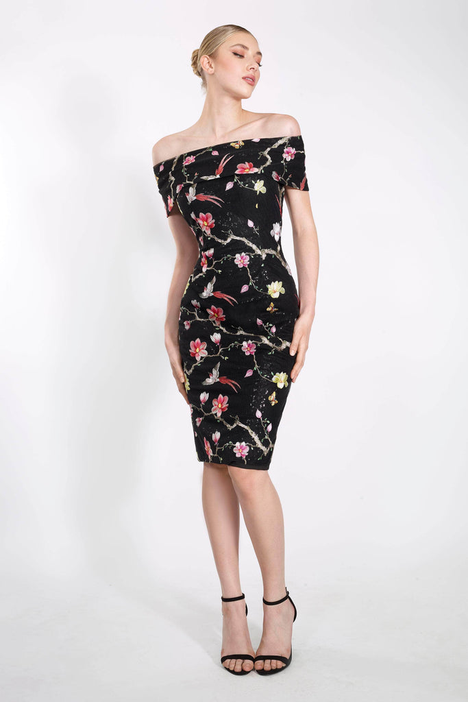Display your feminine side in this wonderfully made Janique 2044 cocktail dress. This floral embroidered ensemble provides color during the dreary days. With embroidered birds and butterflies sewed through the floral motif, one cannot help but hope for spring. Below the butterflies and birds, lies a subtle sparkle sequin lining, giving a glint of shimmer with every step she takes. This Janique dress is perfect for all spring and summer occasions. Model is wearing Black color.