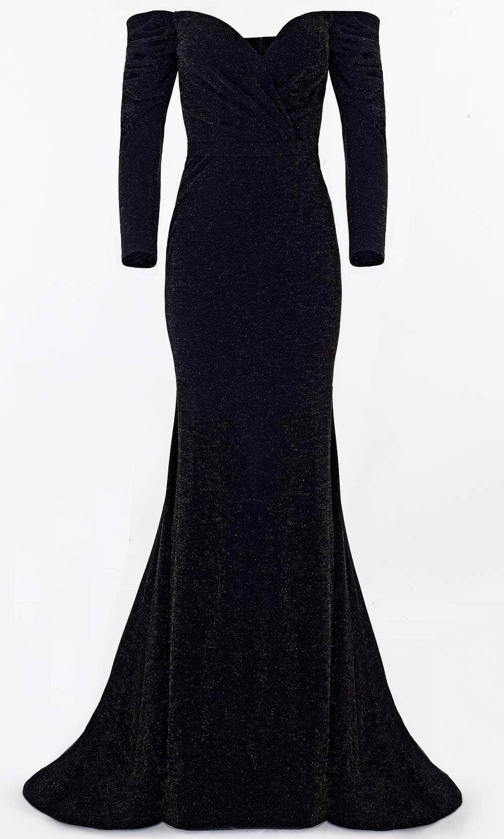 Have all eyes on you as you walk with defined sophistication in this Janique 2157 ensemble. Shine beautifully in this sultry dress, this stunner is crafted in a fully-sequin fabric. It showcases a low-cut sweetheart neckline and with an off-shoulder long sleeve. Gathered ruching details and thin waistband on the fitted bodice defines pleasingly your finest assets while boasting the mid-open back with zipper closure. A simple court train finishes this stunning dress. Make a dramatic entrance and rock the party with this Janique creation. Model is wearing Black and Navy colors.