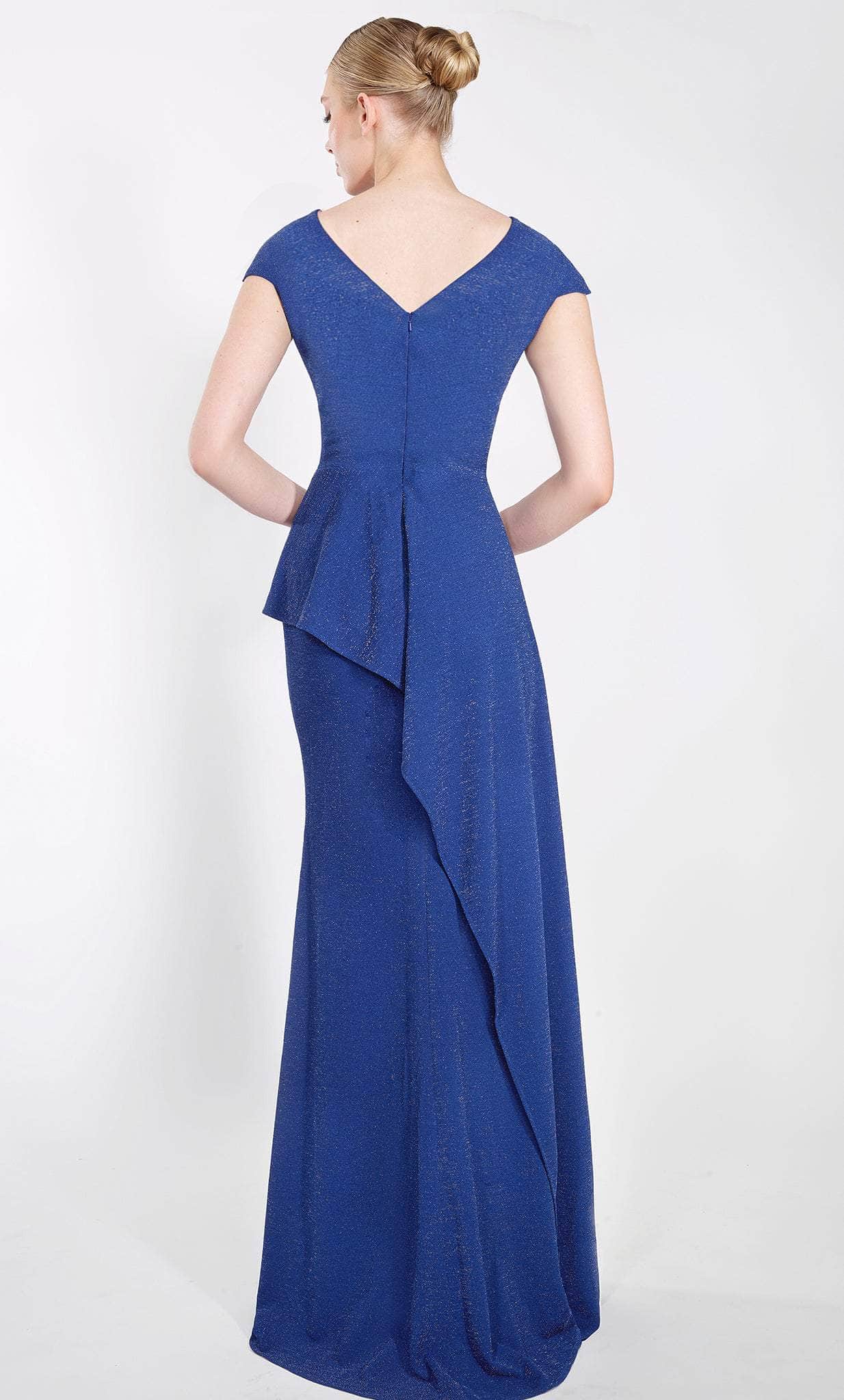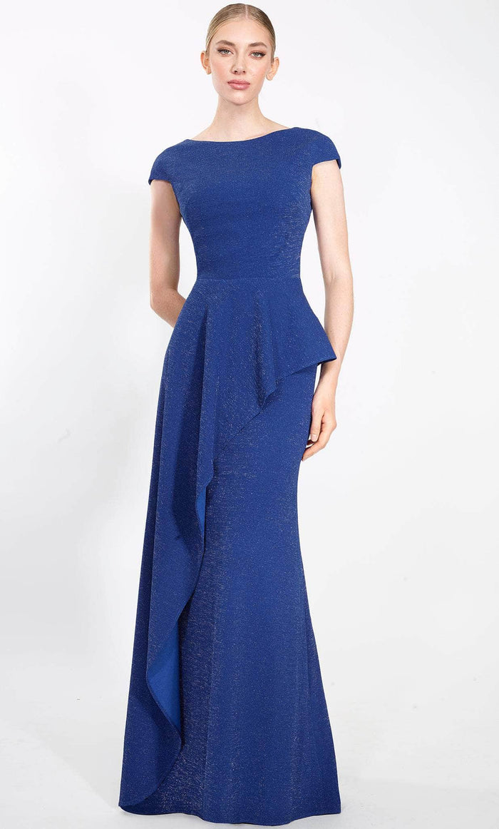 Bask in the fascination of the upscale crowd when you don this design by Janique 2301. Showcases a glamorous bateau neckline and short sleeve, this fitted gown is crafted from glitter material. The back is defined by a mid-open v-shaped cut and a center zipper closure. Accented with asymmetrical high-low peplum, the skirt is sculpted in a sheath silhouette streaming in a full length hem and slight sweep train. Exhibit your softer side in this delightful evening gown by Janique 2301. Model is wearing the Navy color.