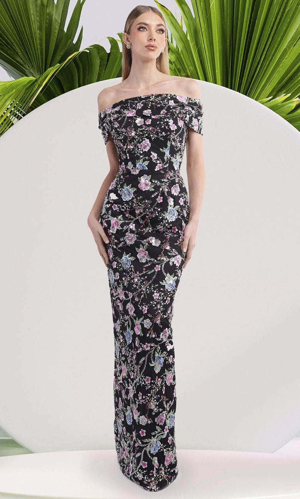 Showcase your grace and beauty in Janique 2444. This floral print sheath gown by Janique is a feminine and elegant choice for any special occasion. The dress has a full length design that showcases your figure and a back slit that adds some flair and movement. The fold over banded sleeves create a unique and flattering look, while the beaded details add some sparkle and glamour. The floral print is colorful and lively, making you stand out from the crowd. Janique 2444 is a beautiful and sophisticated option that will make you feel confident and chic. Model is wearing the Black color.