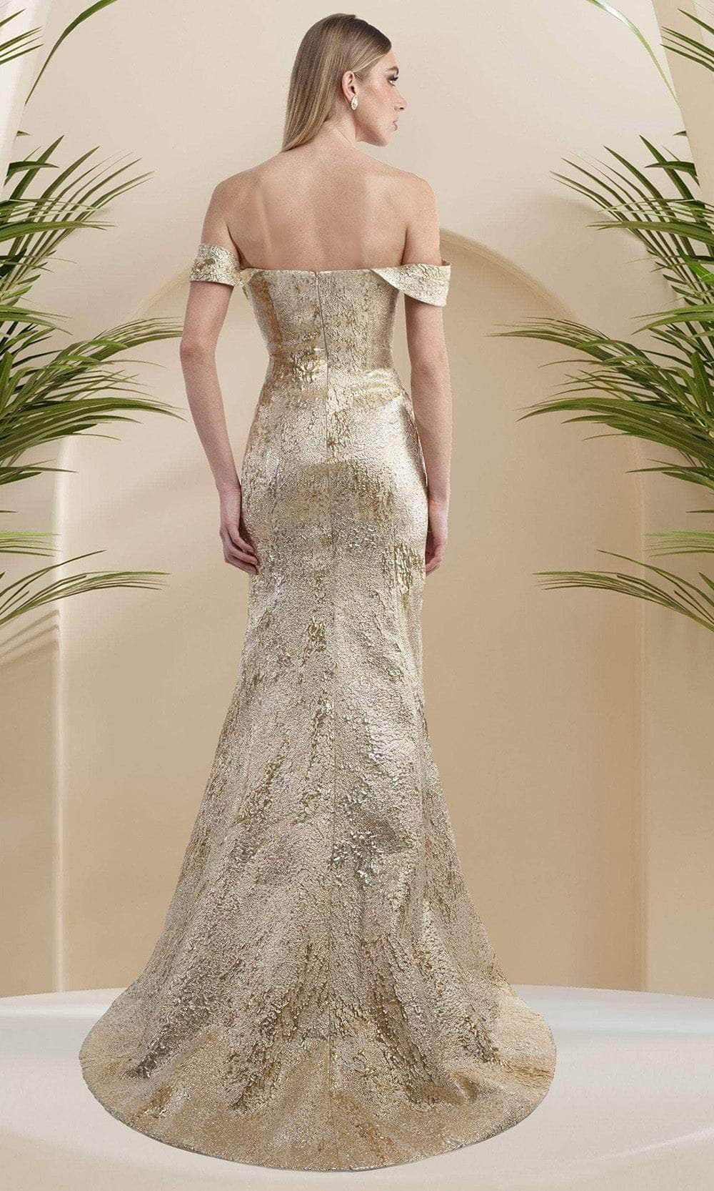 Make it your moment to shine in this magnificent piece, Janique 24982 gown. Crafted from luxurious jacquard fabric, this designer gown is both seductive and modest, with dropped cap sleeves and a form-fitting silhouette. The pleated details add a touch of sophistication, while the leg slit and mid-open back exude confidence and allure. Elevate your style with Janique, the first choice for high end, haute couture fashion. Models are wearing the Gold, and Rose colors.