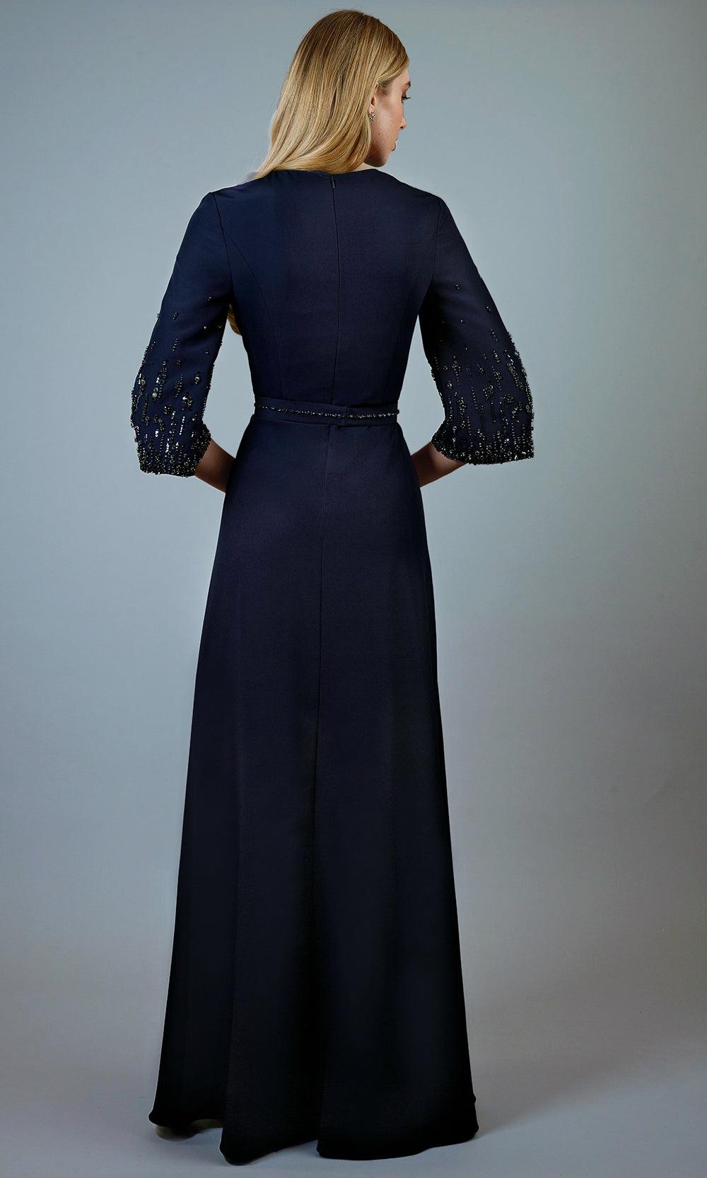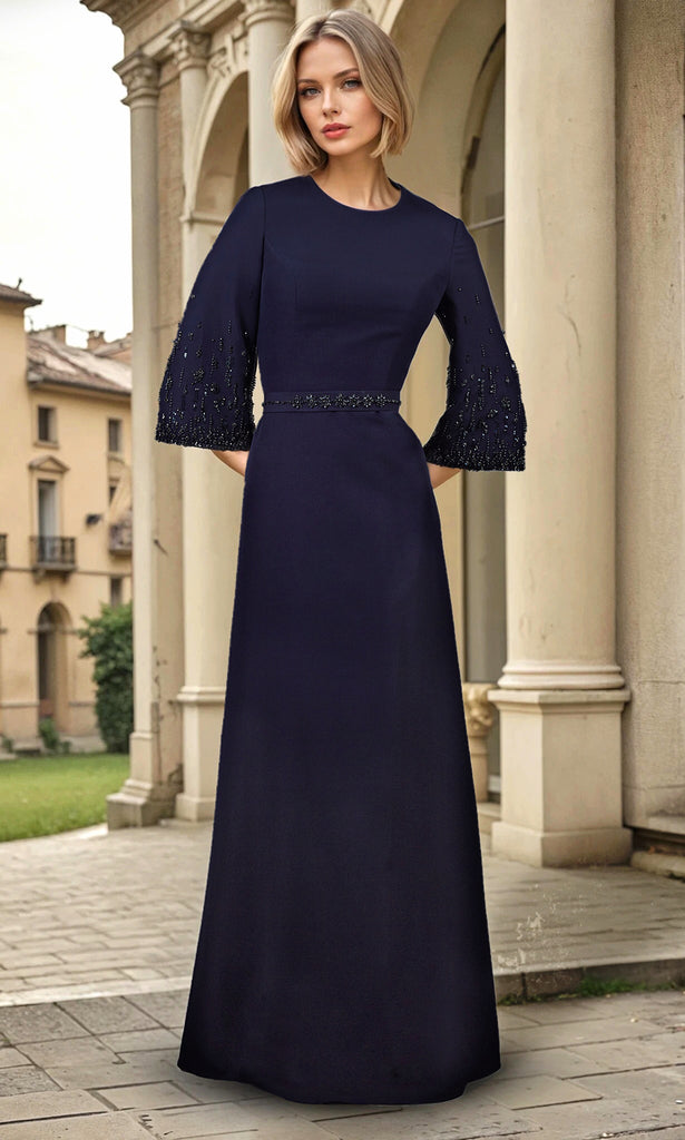 | Details: | Three-Quarter Bell Sleeves, Beaded, Thin Waistband, Full Back, Concealed Back Zipper |