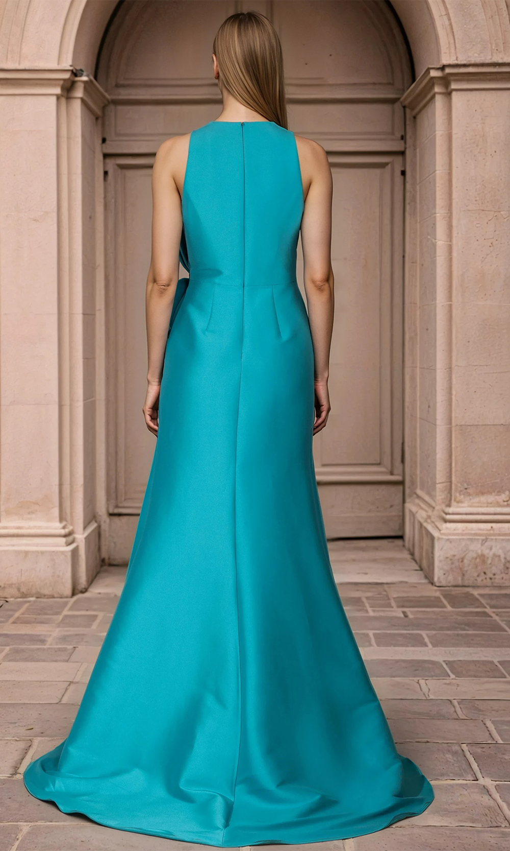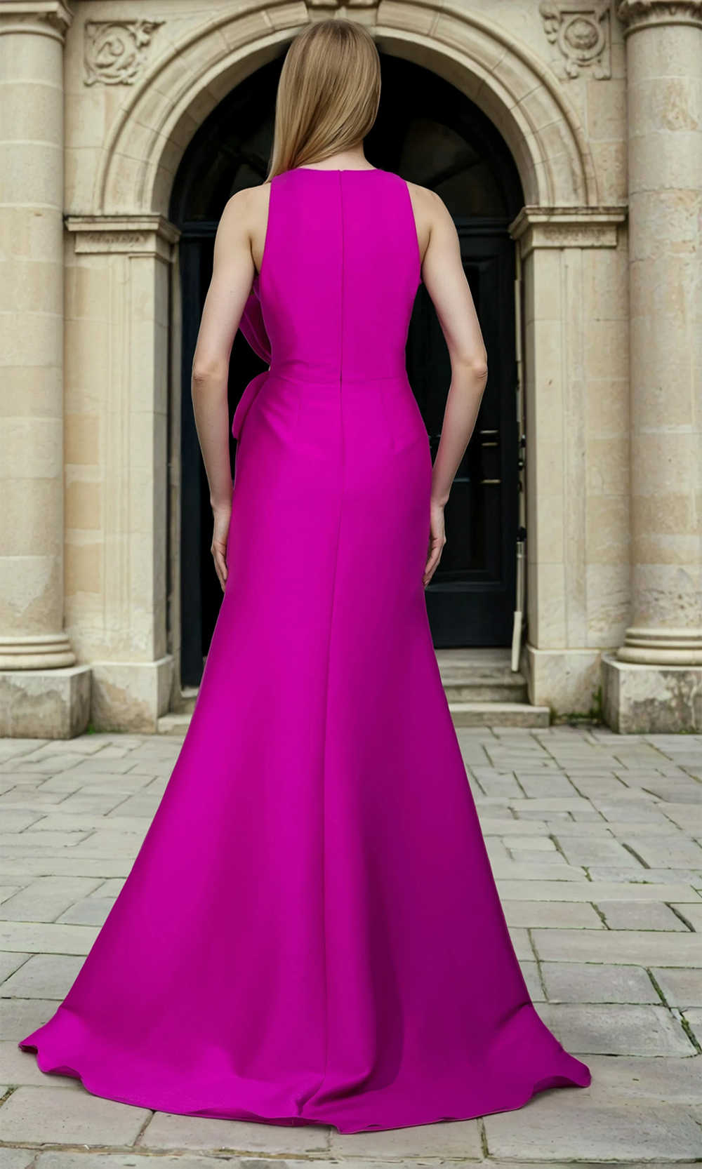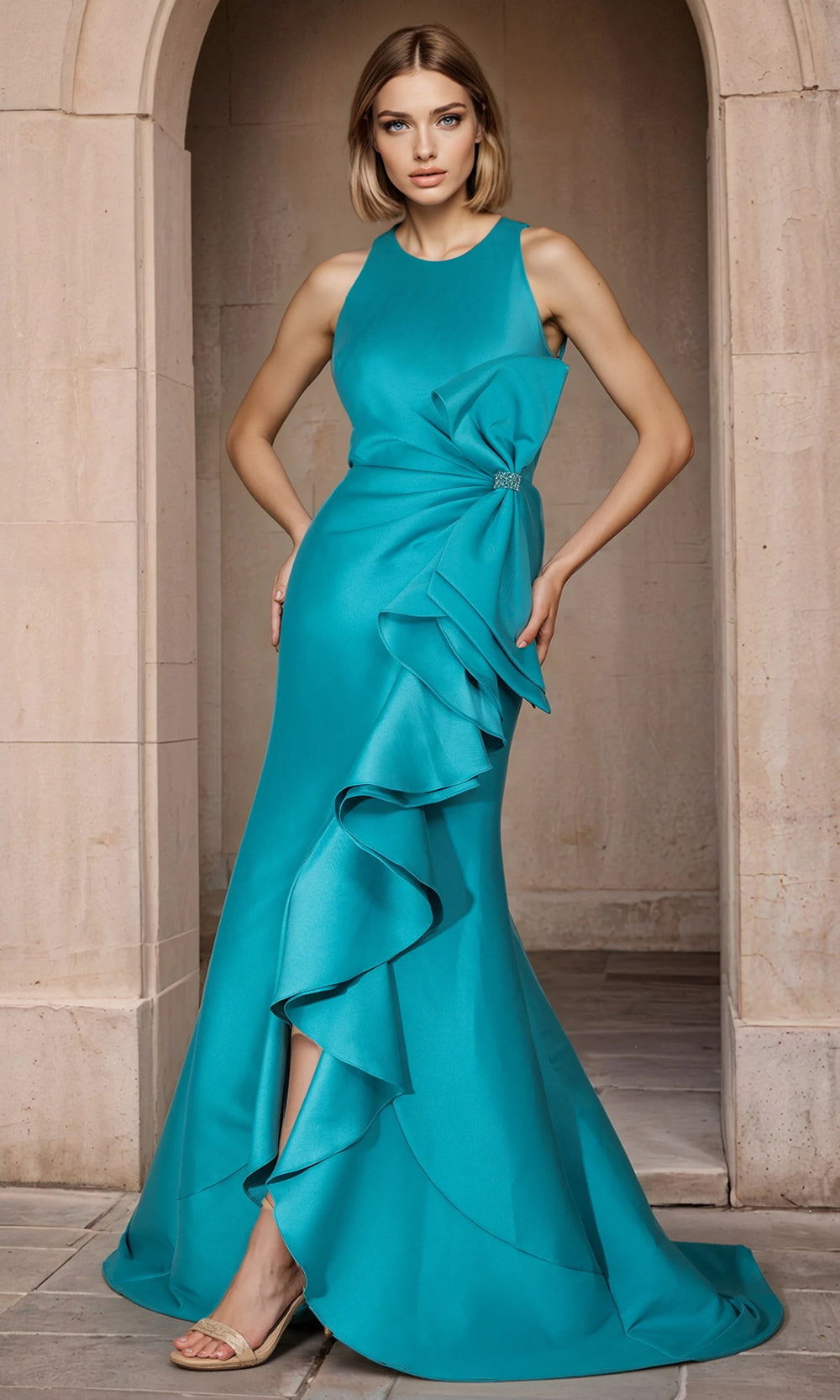 | Details: | Sleeveless, Drape Ruffles, Bow Accent, Slit, Zip Up Back, Sweep Train |