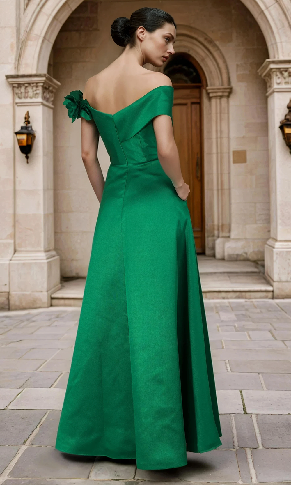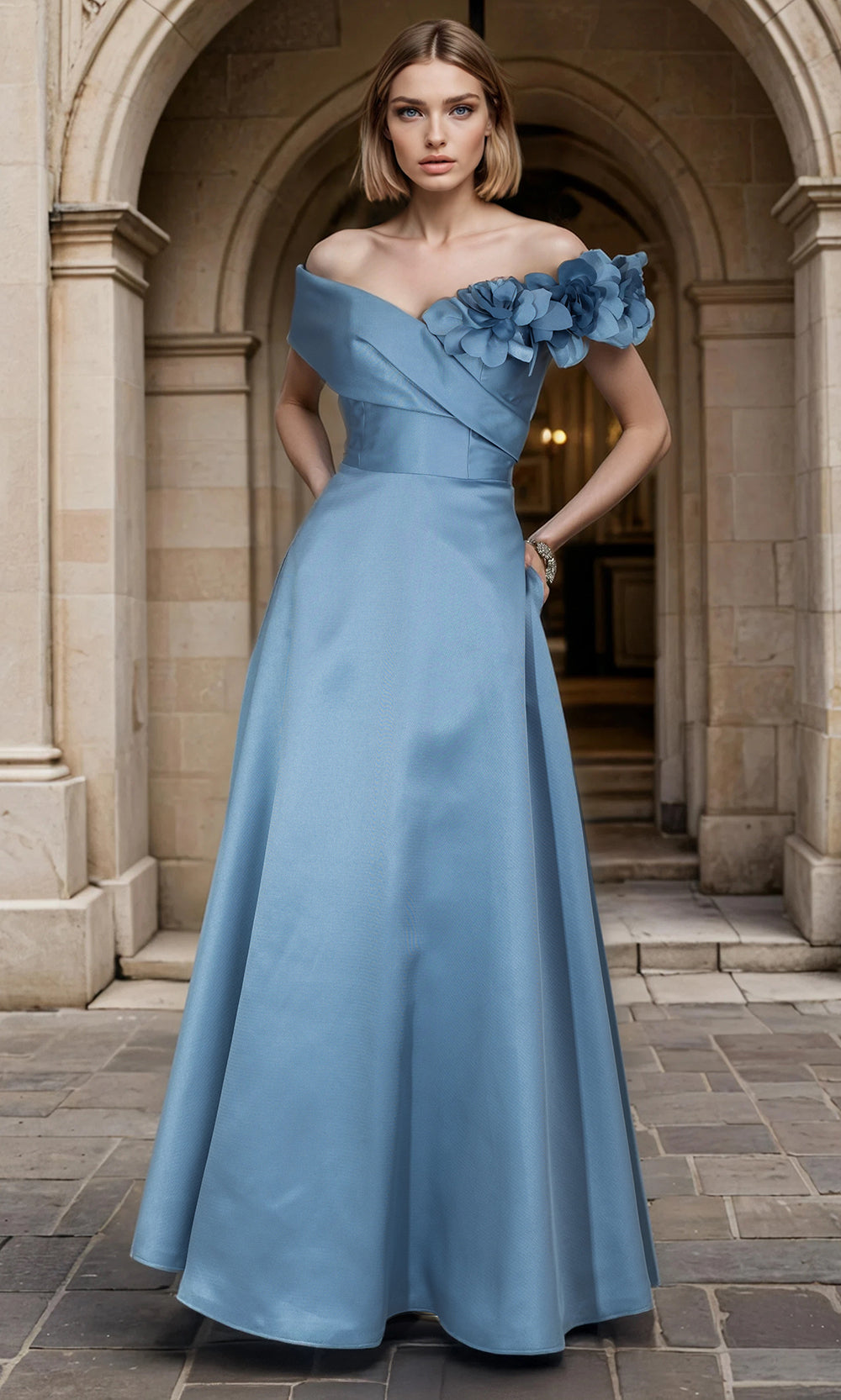 | Details: | V Neck, Fitted Bodice, 3D Floral Accent, Asymmetric Pleats, Side Pocket, Zip Up Back, Floor Length |