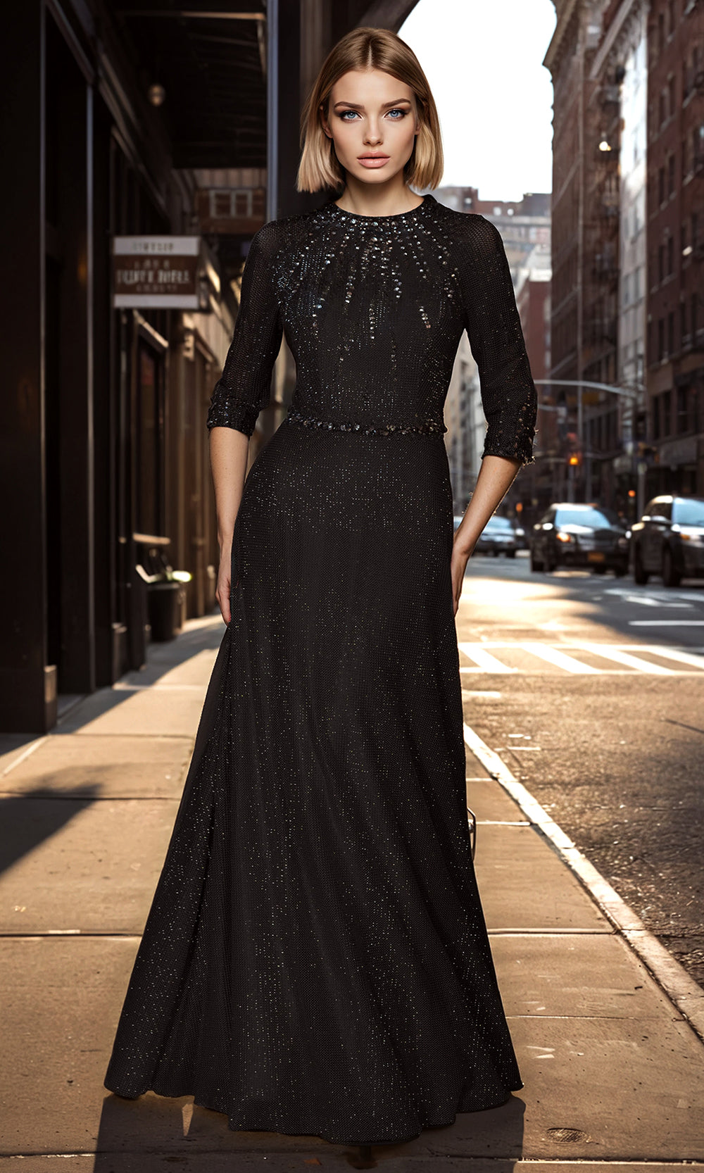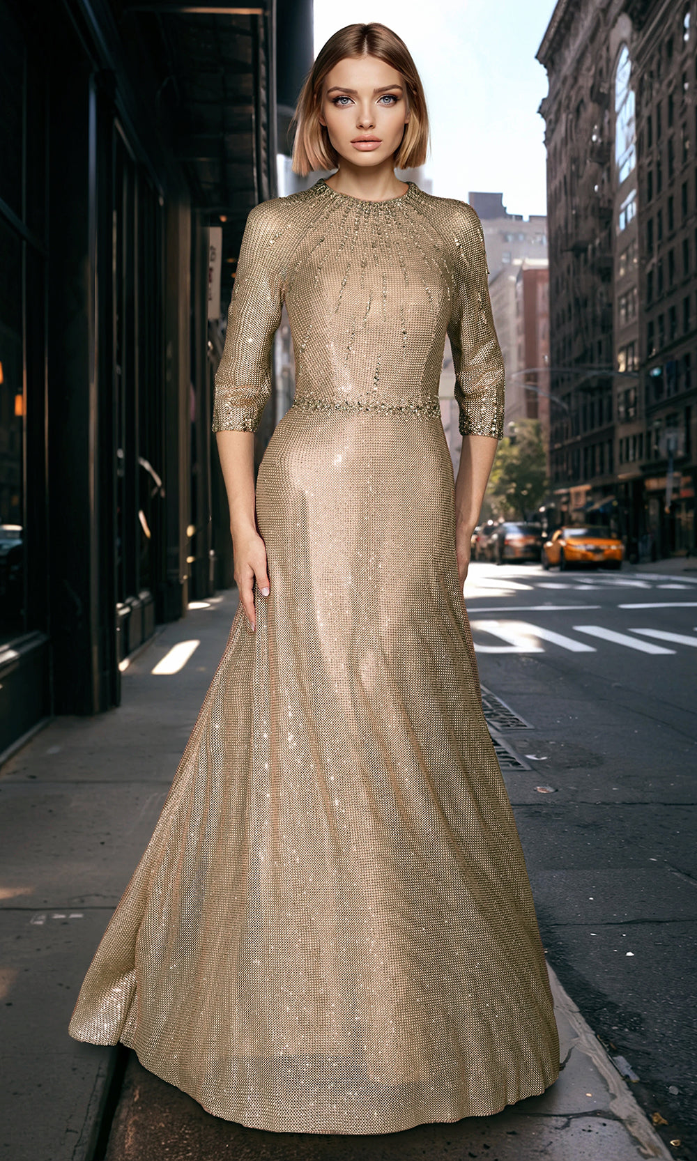 Illuminate every room with Janique 2610, a gown crafted for women who love refined evening shimmer. Its scoop neckline and quarter sleeves offer elegant coverage, while embellished details add polished radiance throughout the mermaid silhouette. The natural waist enhances the wearer's shape as the floor-length finish glides with graceful movement. Perfect for galas, formal dinners, and upscale celebrations, Janique 2610 brings timeless sophistication to your most memorable nights. Models are wearing Black, and Champagne colors