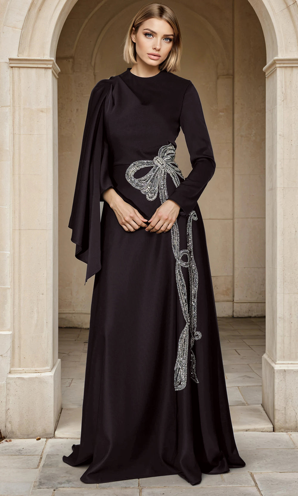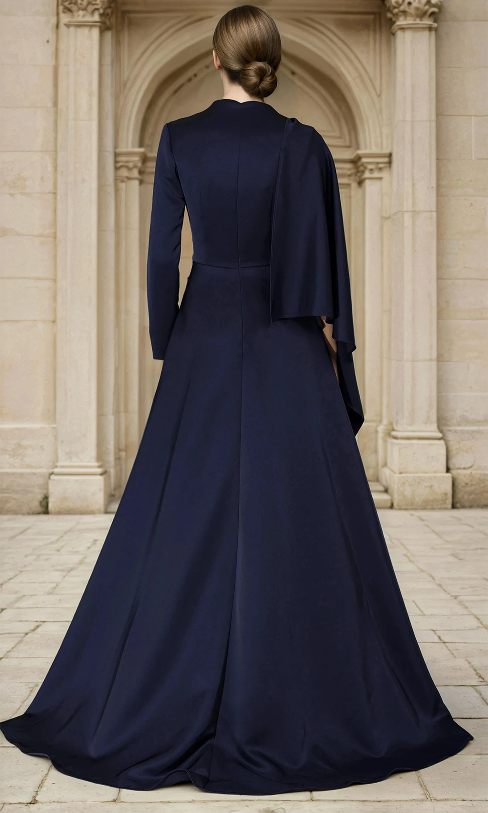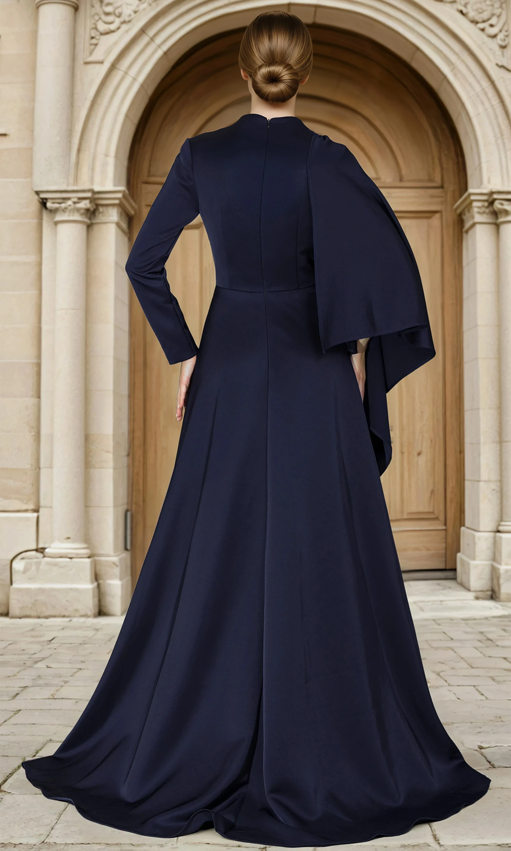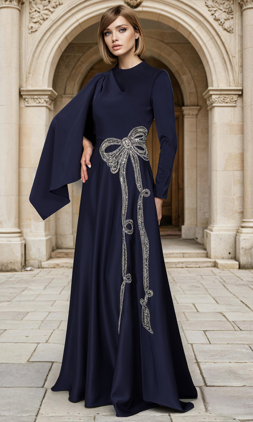 Step into elevated sophistication with Janique 268009, a gown designed to highlight clean, sculptural elegance. Its scoop neckline and long draped cape sleeves create a striking, fluid profile, while the embellished bow appliqué adds refined focal detail. The natural waist leads into an A-line silhouette with a graceful sweep train for polished movement. Finished with a sleek zip up back, this floor length gown is ideal for galas, formal evenings, and upscale celebrations. Models are wearing Black, and Navy colors.