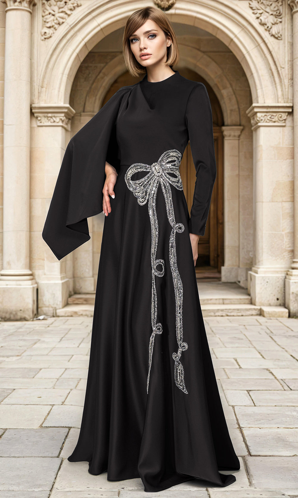 | Details: | Draped Cape Sleeve, Long Sleeve, Embellished Bow Applique, Zip Up Back, Sweep Train |