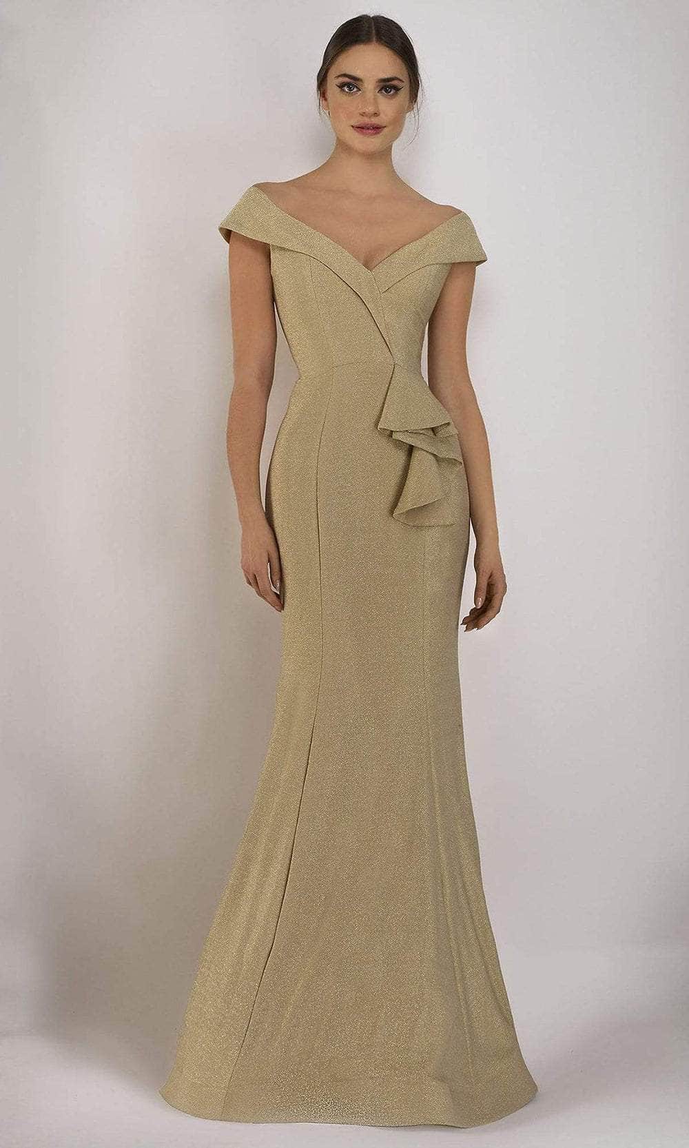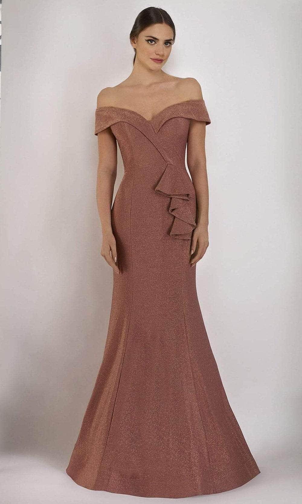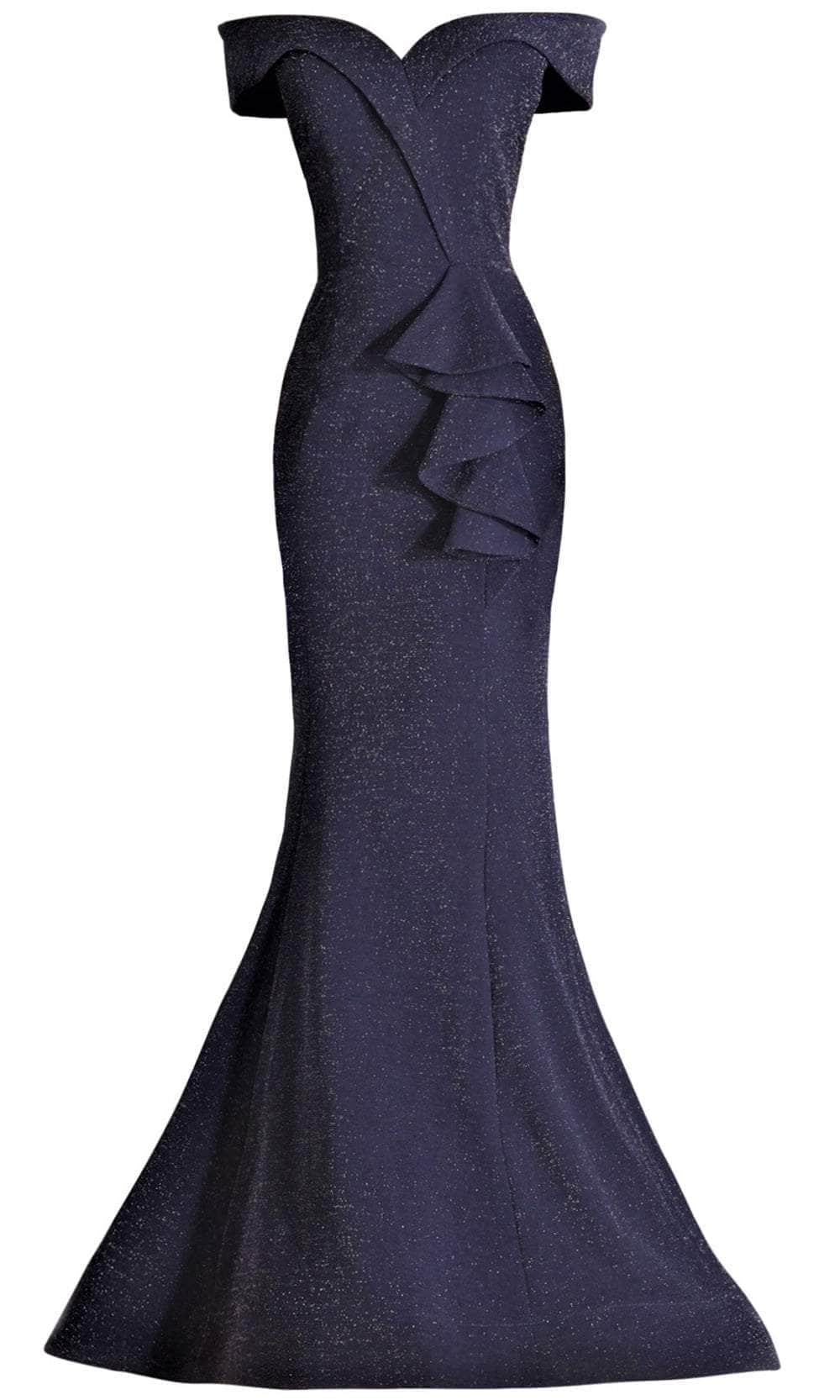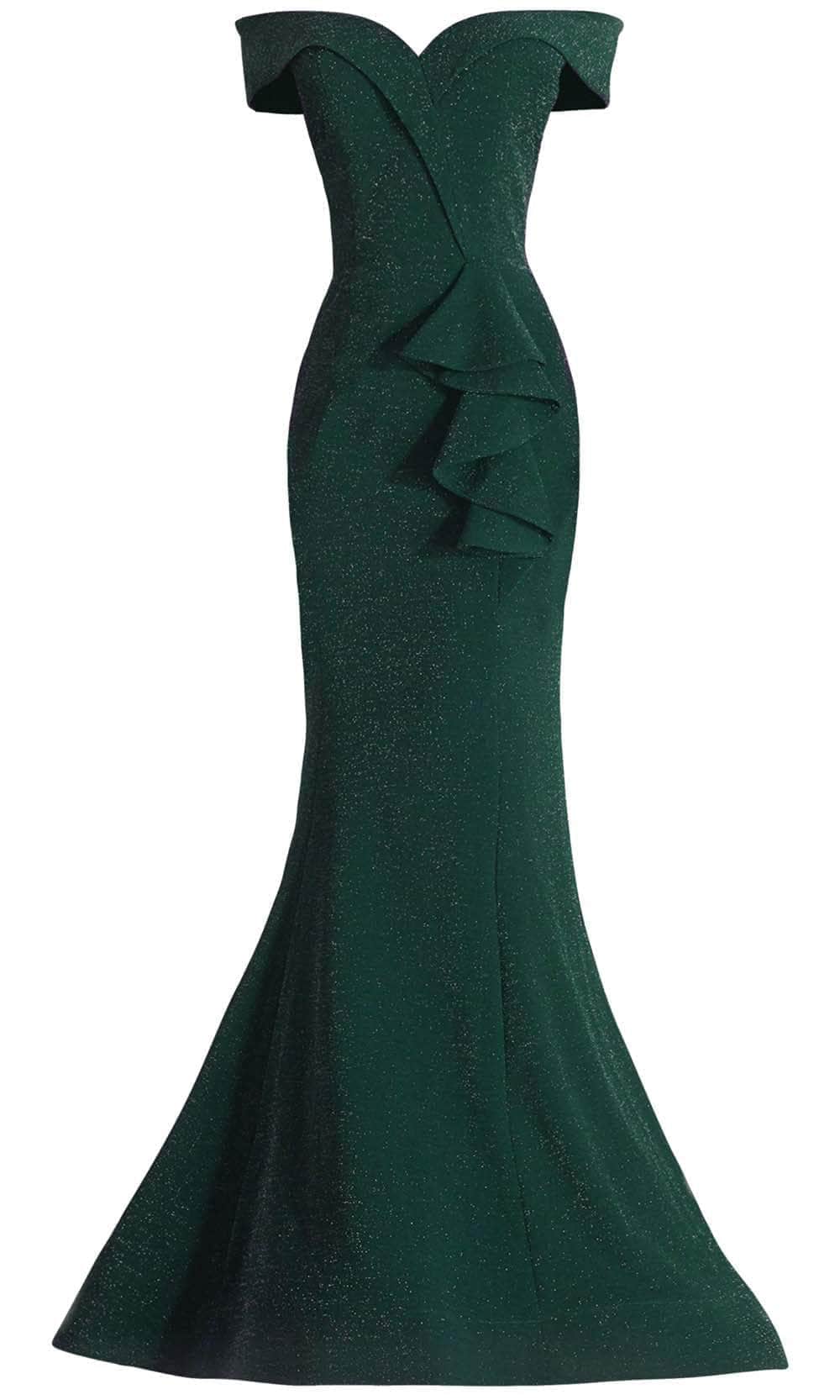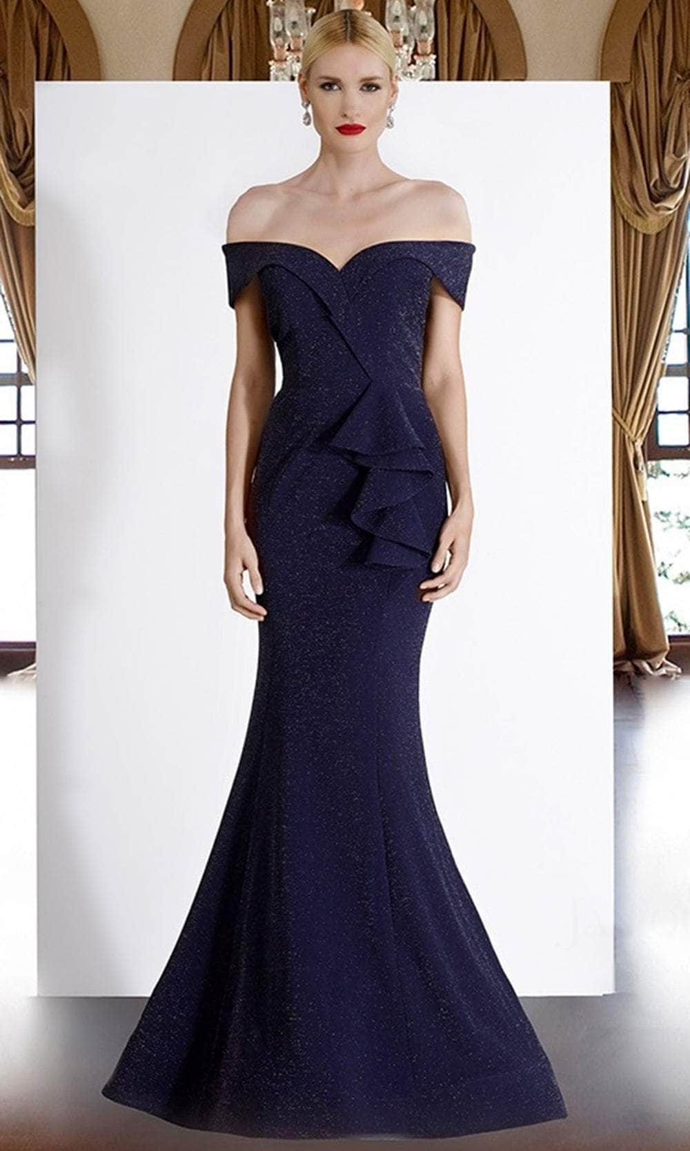Radiate unmatched elegance at your special event in the shimmering Janique 2936 Evening dress. This stunning gown features a fold-over off-the-shoulder V-neckline, gracefully converging into a faux surplice bodice with a perfectly fitted top enhanced by princess seams. A ruffled accent elegantly cascades down one side of the hips, adding a touch of drama to the design. The trumpet skirt fits and flares beautifully, flowing effortlessly to the floor. Perfect for making a grand entrance, this Janique 2936 masterpiece ensures you glide into any occasion with pure sophistication, leaving a lasting impression on all who see you.