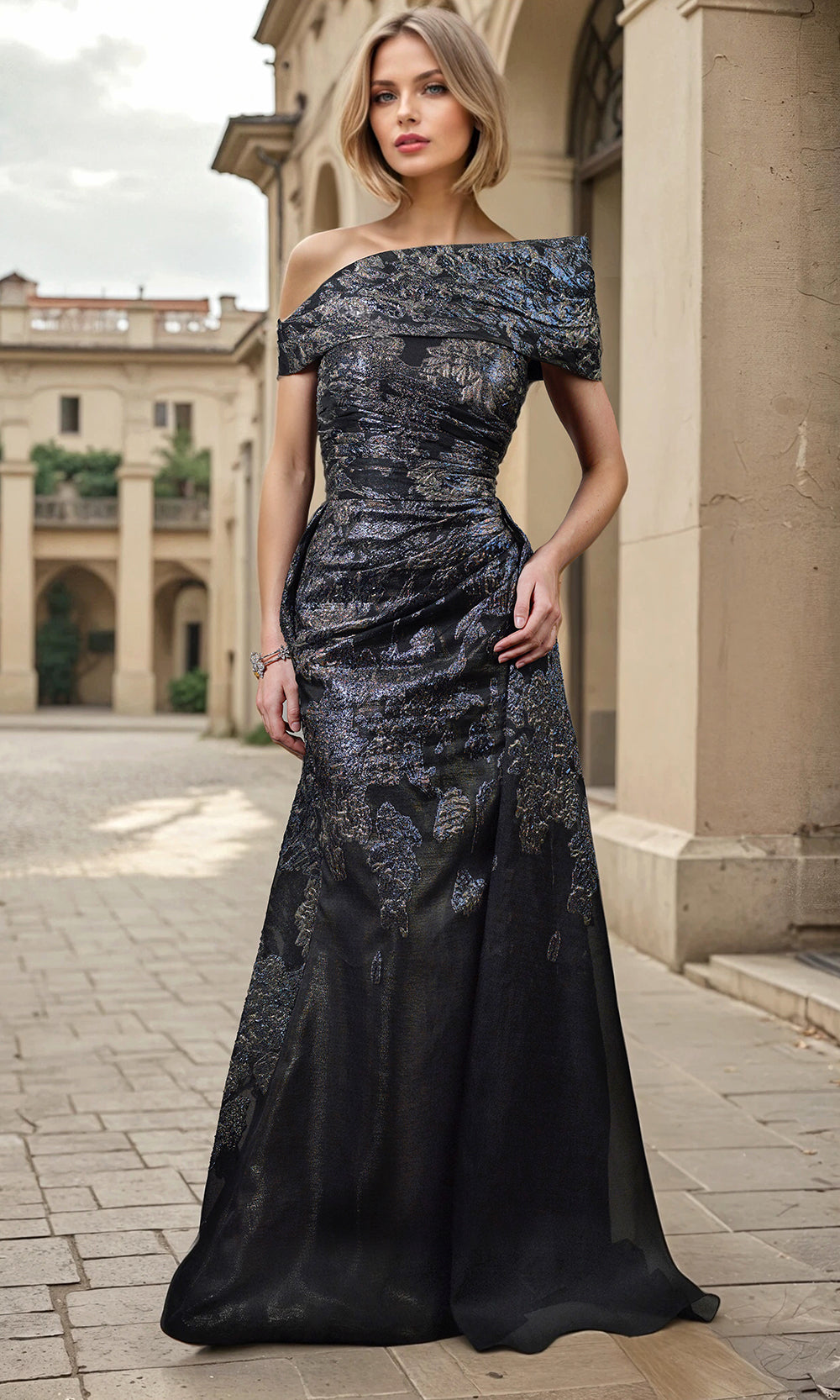 Embrace the moment in a Janique 361050 gown that defines sophistication through balance, flow, and effortless radiance. The strapless straight-across neckline draws the eye upward while soft ruching enhances the waist and adds sculptural shape. The detachable overlay enhances versatility, creating either an off-shoulder or asymmetrical neckline to match your style preference. A tailored sheath skirt allows poised movement, balanced by an overskirt that introduces delicate depth. Janique 361050 brings lasting grace to any celebration, turning every step into an expression of elegance. Model is wearing Black/Cobalt color.