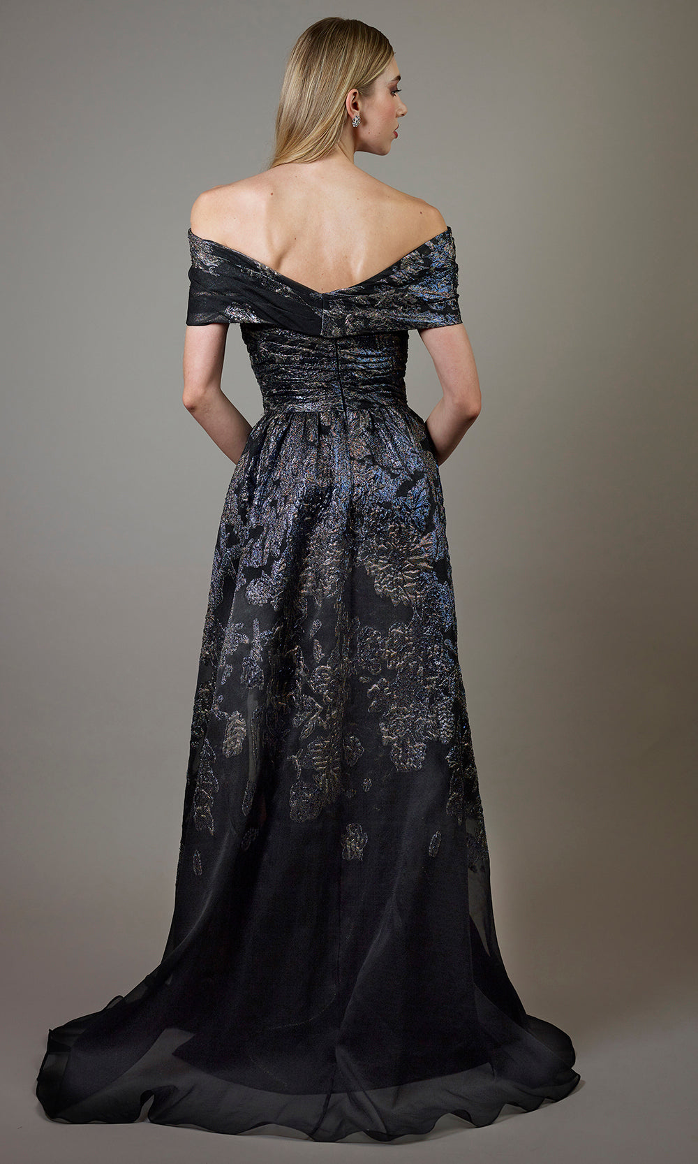 | Details: | Textured Bodice, Ruched, Strapless, Detachable Overlay, Sweep Train, Overskirt |