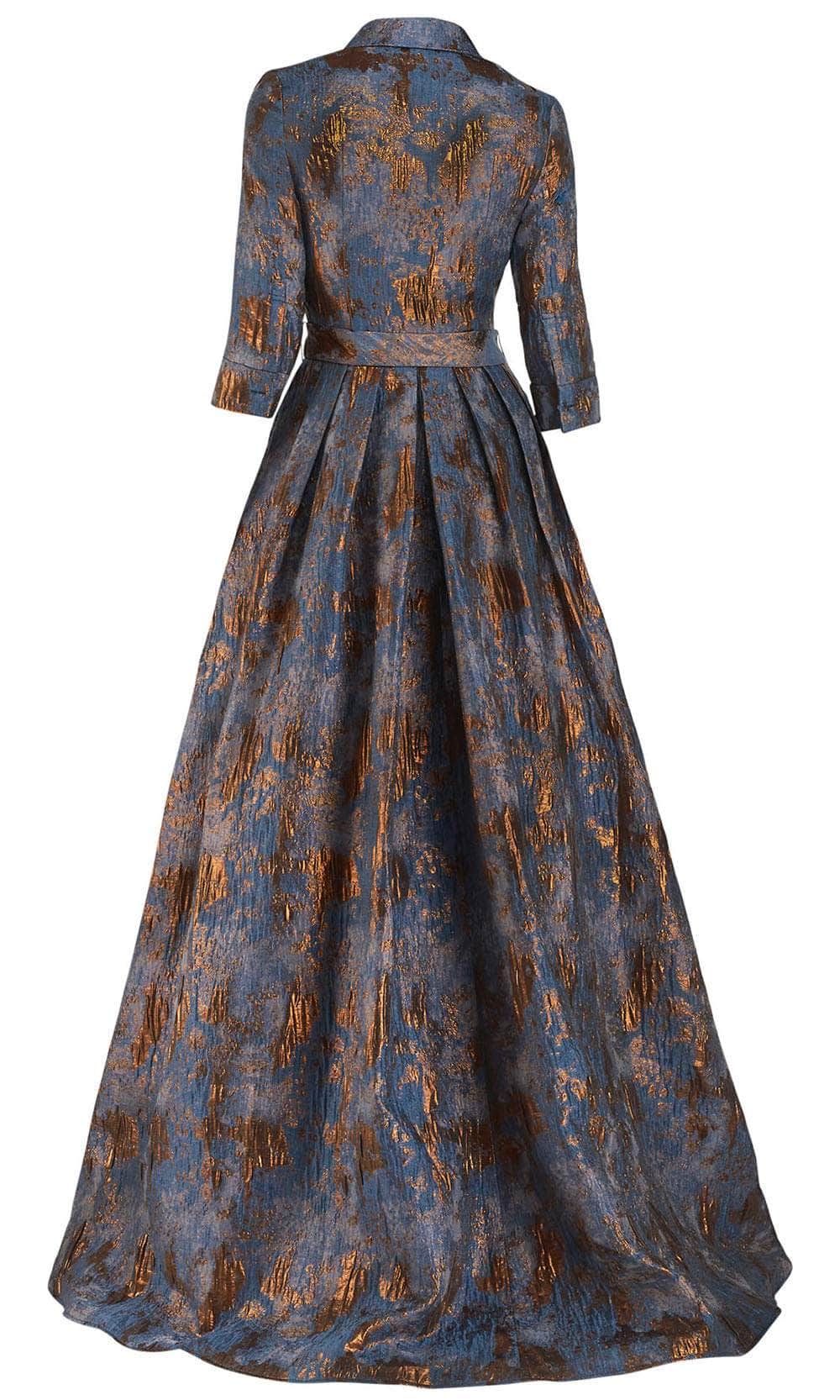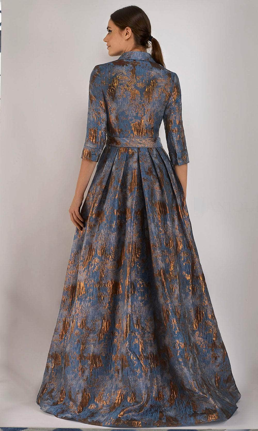 Introduce a timelessly chic style in this artistically crafted Janique 71321 creation. Mottled with metallic accents on a jacquard fabric, this stunner shows a collared neckline that trails into a button down bodice. The slender quarter sleeves are accentuated with folded cuffs. A tie-waistband highlight the natural waist. The rich A-line silhouette skirt displays front high slit and a brush of train on the floors. Showcase an interpretation of classy appeal in this Janique masterpiece. Model is wearing the Blue color.