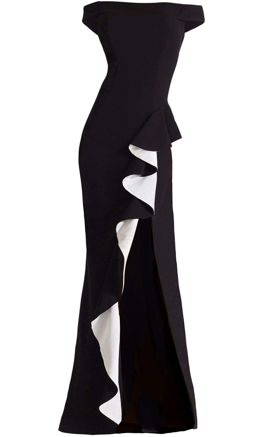 Make a jaw dropping appearance at your next event in this stunning Janique C1870 evening dress. An off-shoulder neckline crowns the fitted bodice contoured with tailoring seams, complemented with a mid-open back. A ruffle detail accents the side as it emphasizes the slit. This dress reveals a sheath silhouette that tapers to full length. Flattering on all figures, this Janique evening dress is a must have this season.
