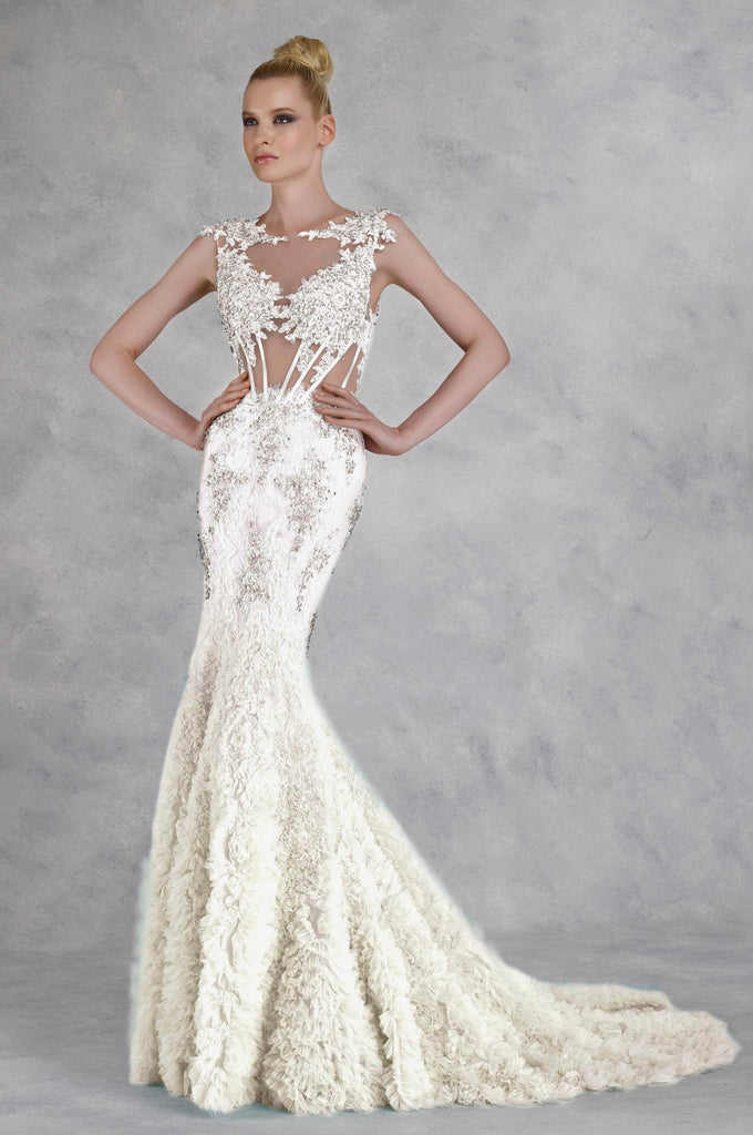 Details: Lace/Tulle, Cap sleeves, Sheer upper bodice with floral applique, Full length hem with back train