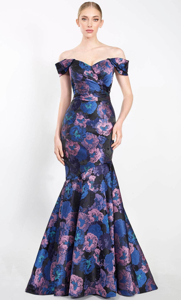 Set the stage and have everyone mesmerized when you walk down the red carpet in this vibrant Janique P23002 creation. Featuring a richly tailored silhouette with its wrap style bodice accented with fine ruching, this gown shows an off shoulder neckline with foldover straps. Vibrant floral details adorn the gown’s figure flattering design. Styled with a deep v-open back and an asymmetrical tapered silhouette, the skirt releases into a trumpet design that flows into a sweeping trail of train. Revel in the timeless and alluring element of this exquisite Janique masterpiece. Model is wearing the Blue/Purple color.