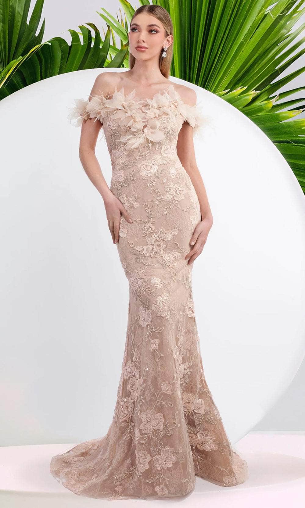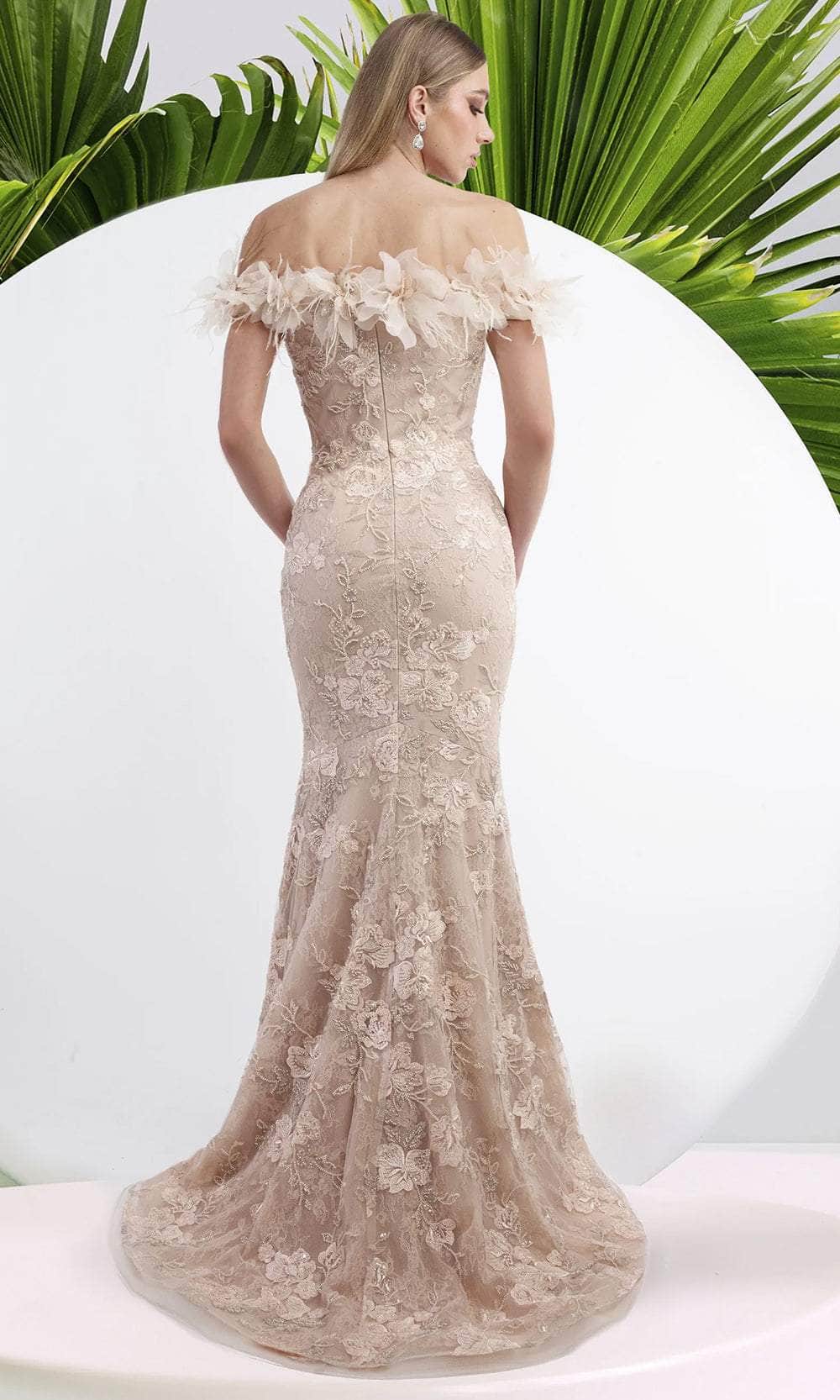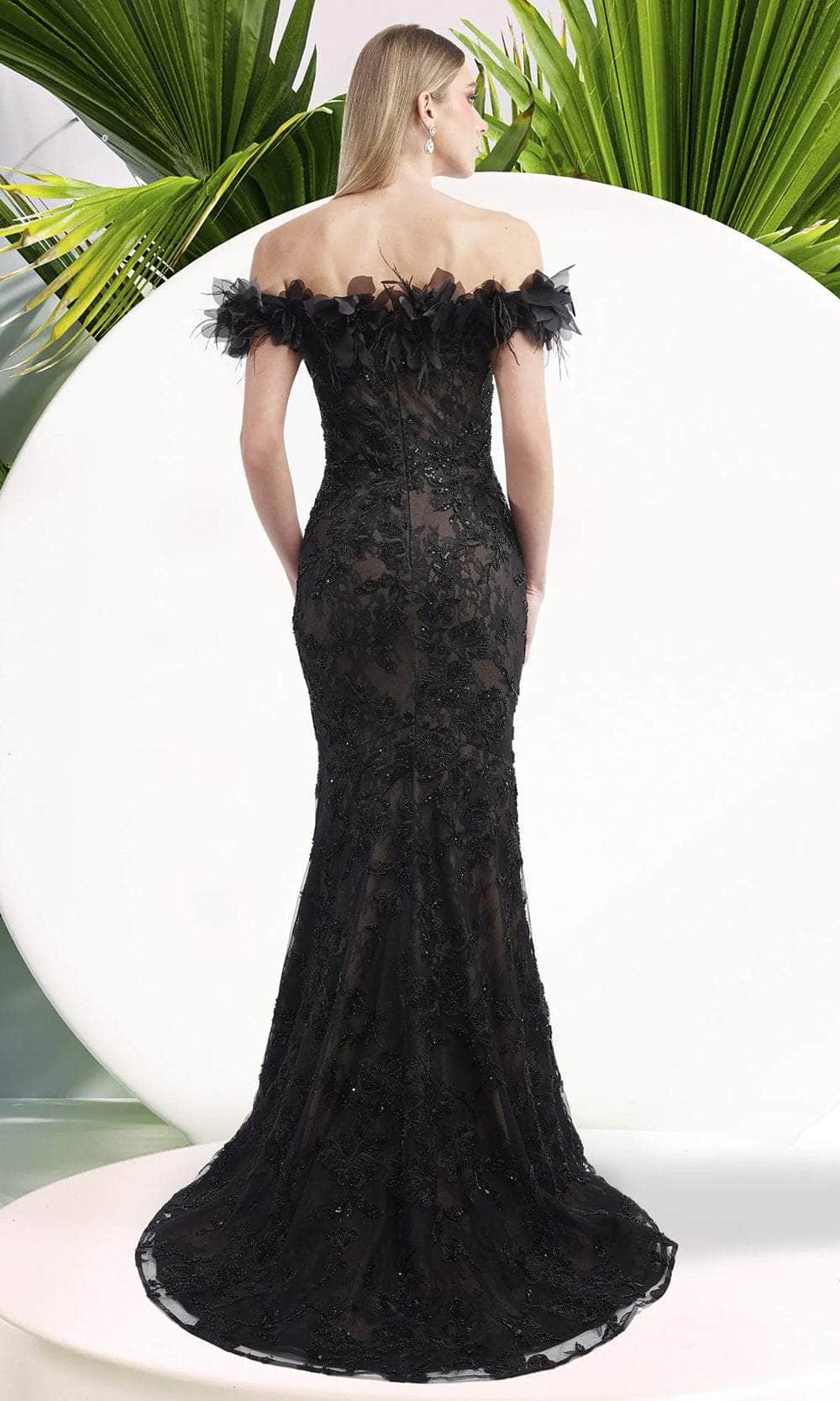 Look exquisite and elegant in the Janique W3015 gown. This gown is a masterpiece of embellished floral lace, creating a stunning texture and pattern. The off shoulder neckline is adorned with 3d floral applique, adding a touch of romance and charm. The beaded details sparkle and shine, while the form fitting bodice and bare yoke accentuate your figure. The gowns soft train and mermaid skirt add movement and grace. Janique W3015 is sophisticated, elegant, and feminine, perfect for any special occasion. Models are wearing the Black, and Champagne variants of the dress.