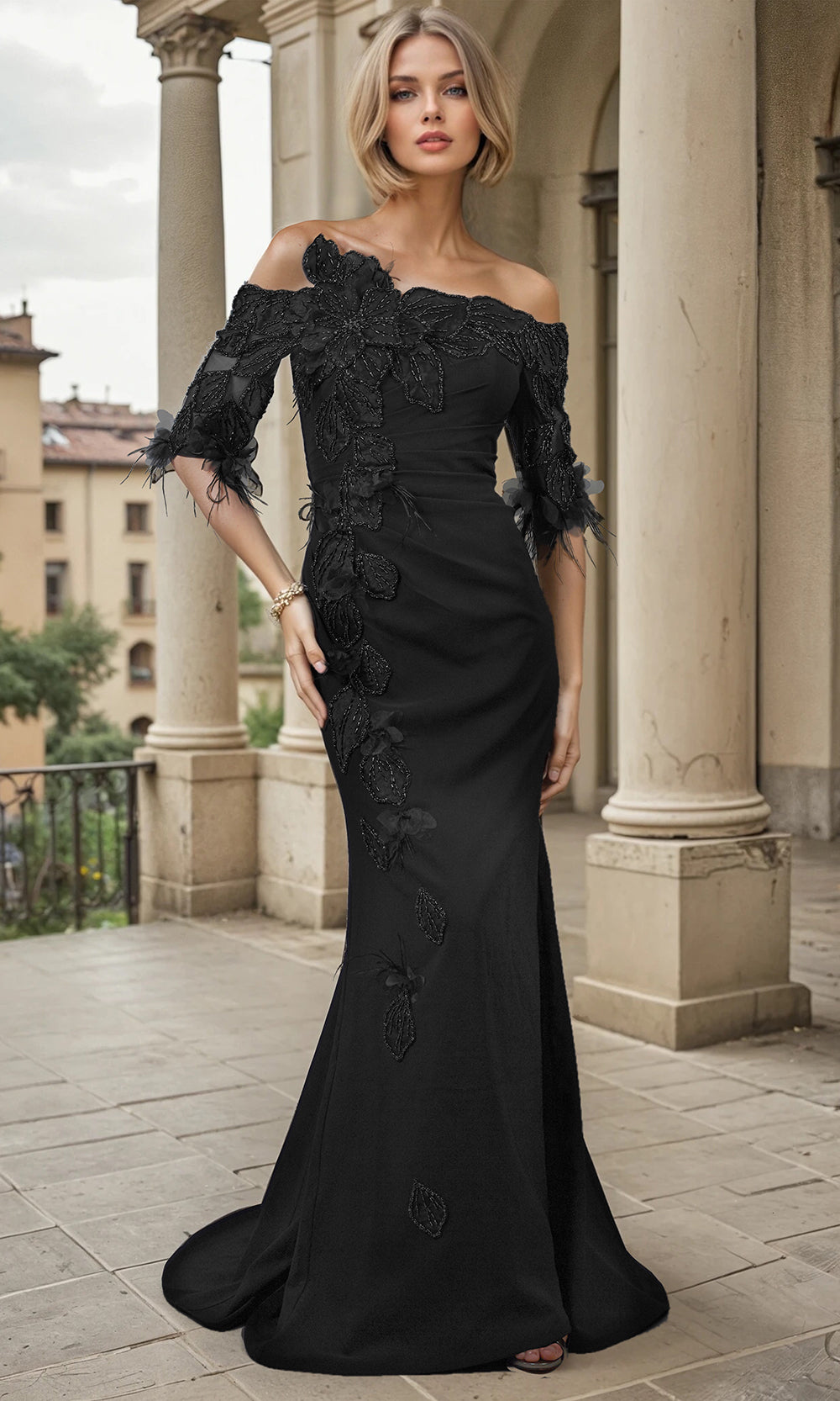 Distinctive texture and contour make Janique W3061 a captivating piece from first glance. The off shoulder neckline highlights the shoulders and collarbone, leading into elegant sheer three-quarter sleeves trimmed with soft feathers. Floral lace applique and beading cascades from the neckline down the length of the gown, adding depth and dimension. The fitted structure traces the body before flaring at the hem to form a graceful mermaid silhouette. A gentle sweep train completes the look with balance and poise. Janique W3061 is a refined option for anyone seeking presence and artistry in one ensemble. Models are wearing Black, and Navy colors.