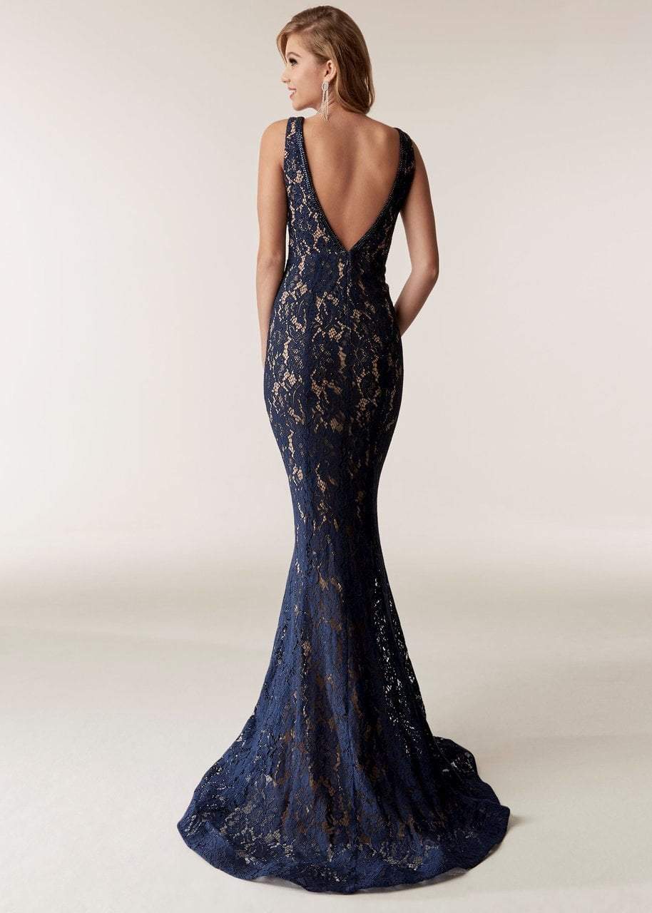 Be the loveliest of them all wearing this long dress by Jasz Couture 6287. Flaunts a sleeveless, plunging V-neckline with mesh. The entire dress is made of beaded lace. The back has a low V-cut and a zipper closure. Completing the look is a mini train for added drama. Be ready to mesmerize the night in this Jasz Couture creation. Model is wearing Navy color.