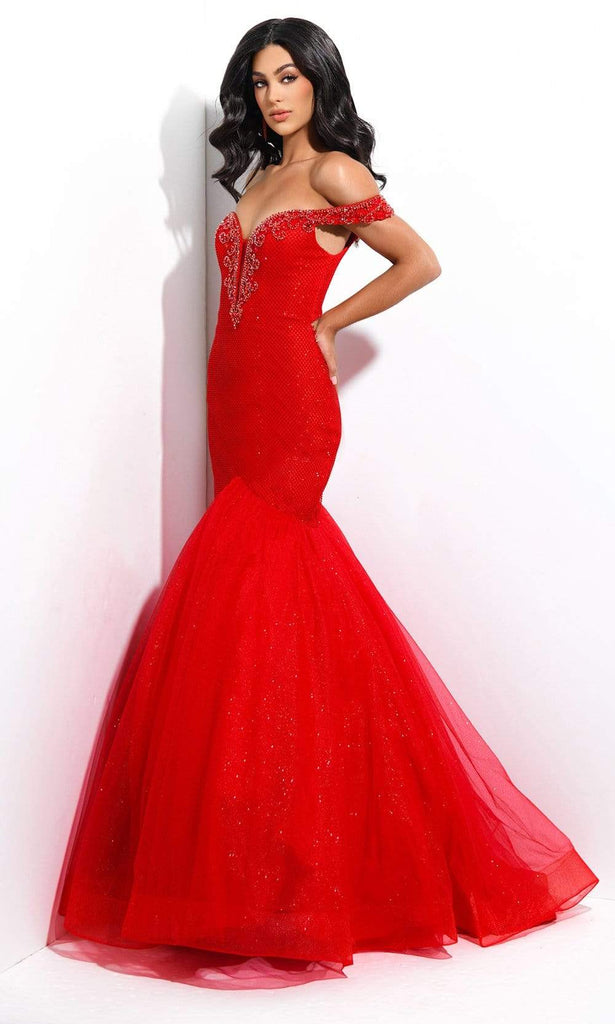 Walk in a defined sophistication and beauty wearing this Jasz Couture 7301 creation. Intricate beaded work accentuates the sweetheart neckline and continuously gives sparkle around its off-shoulder sleeves and on to the back. A mid open back and a key hole design to show some skin for a sexy and seductive look. With a lace-up string support and finishes off on a full tulle fabric on this trumpet dress. Leave a trail of admirers as you glisten in beauty in this Jasz Couture masterpiece. Model is wearing Red color. The designing finesse, intricacy of detailing, and the perfect, true to size fitting that help these dresses stand out makes Jasz Couture Dresses so unique.