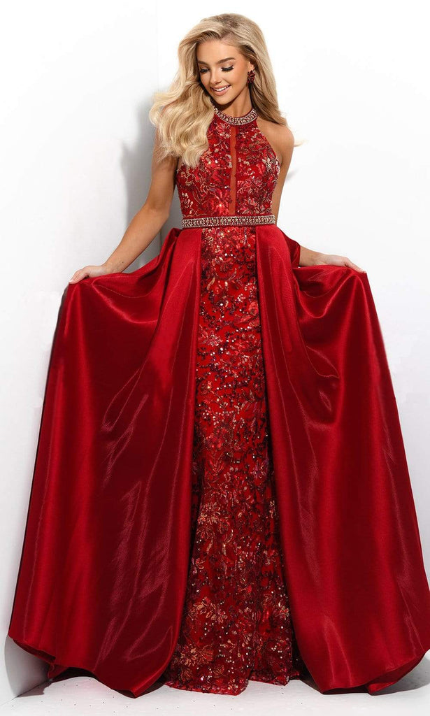 Optimize the attraction of your special event in this alluring dress by Jasz Couture 7316. Styled in a sumptuous embellishment, this stunner shows off a gorgeous crafted halter neckline with a sheer panel on the chest. A bold and solid waist cape embraces and balances the shimmering fitted bodice. A sizeable keyhole back shows off some skin with a zipper closure. Sheath skirt dramatically flows into a full-length hemline with a sweeping train. You will definitely make a statement in every occasion in this Jasz Couture collection. The designing finesse, intricacy of detailing, and the perfect, true to size fitting that help these dresses stand out makes Jasz Couture Dresses so unique.
