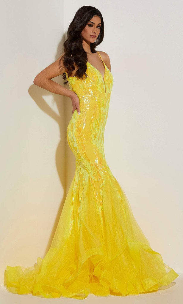 Prepare to dazzle the dance floor in the Jasz Couture 7443, captivating everyone with your grace. This striking dress showcases a meticulously crafted, sleeveless fitted bodice with a plunging sweetheart neckline, accentuated by sparkling sequin embellishments. The V-shaped open back adds an alluring touch. The skirt, designed with a horsehair hem, gracefully flows into a sweep train, embodying a full-length hem and a mermaid-like parade silhouette. Get ready to command the spotlight at that special event in this exquisite masterpiece by Jasz Couture 7443.Models are wearing Orange, Black/Silver, Fuchsia, Ocean Blue, Pink and Yellow colors.