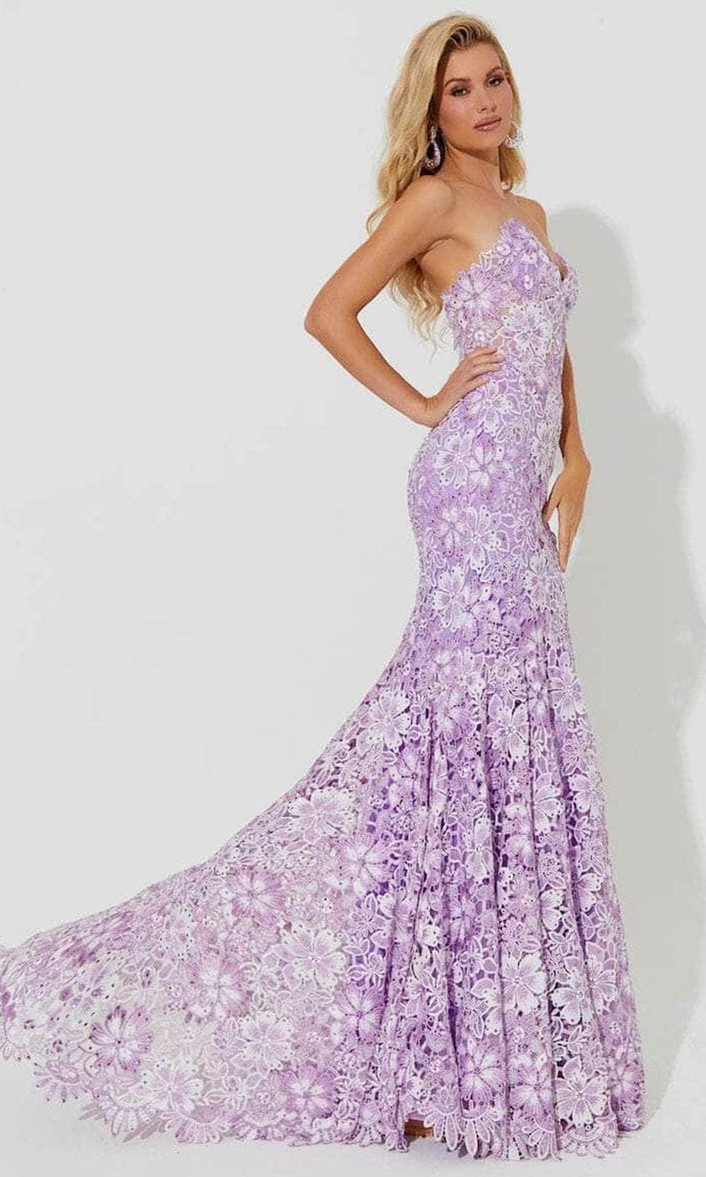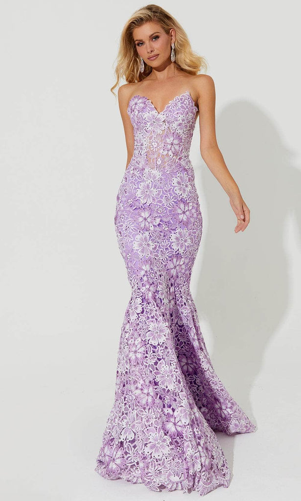 Flourish in fine elegance with this captivatingly crafted Jasz Couture 7535 creation. Flaunting tailoring details on a floral lace overlaid silhouette with rhinestone details sprinkled allover its length, this stunner features spaghetti straps that strung the deep v-open back. Crafted with a midrise styled back and a concealed zipper closure, the mermaid skirt sculpts and elegantly fans into a sweeping train. Exude a romantic flair at your stunning event in this Jasz Couture 7535 masterpiece. Model is wearing the Lilac color.
