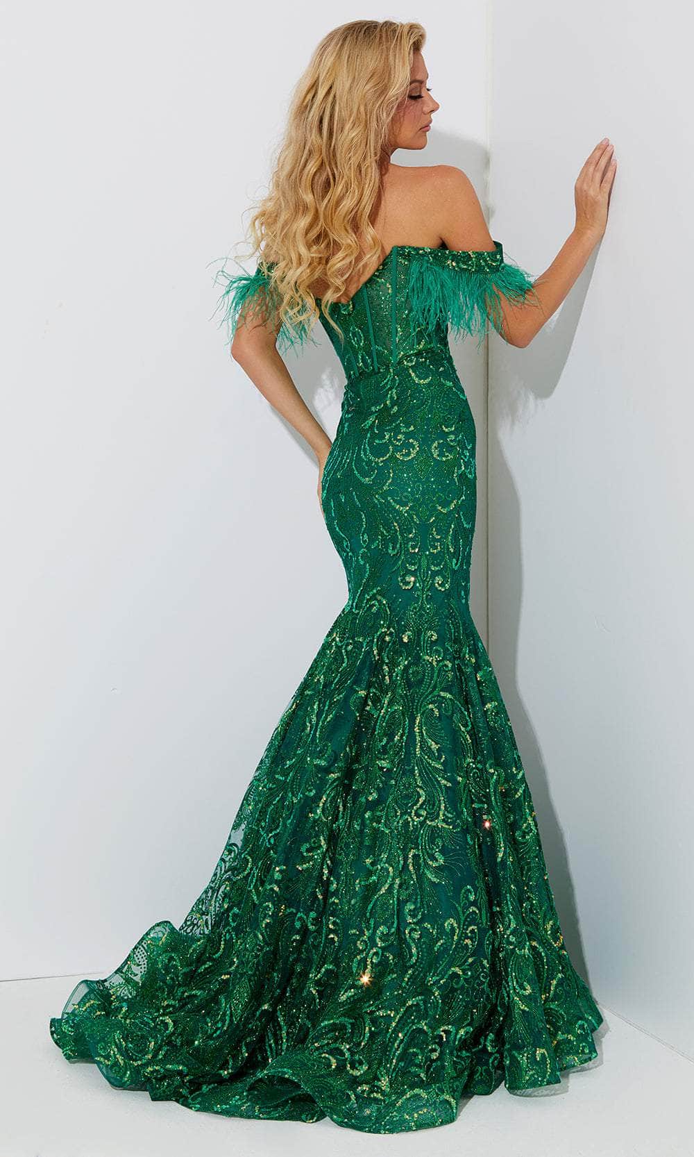 Capture the essence of opulence in Jasz Couture 7568, a dress adorned with lavish appliques that epitomize sophistication. The corset bodice provides a flattering fit, while the off-shoulder neckline adorned with feather details at the sleeves adds a touch of ethereal charm. The floor-length skirt gracefully transitions into a mermaid silhouette, creating a stunning silhouette. Concluding with a train, this Jasz Couture 7568 is a seamless blend of timeless elegance and contemporary allure, making it a captivating choice for any special occasion. Model is wearing Green color.