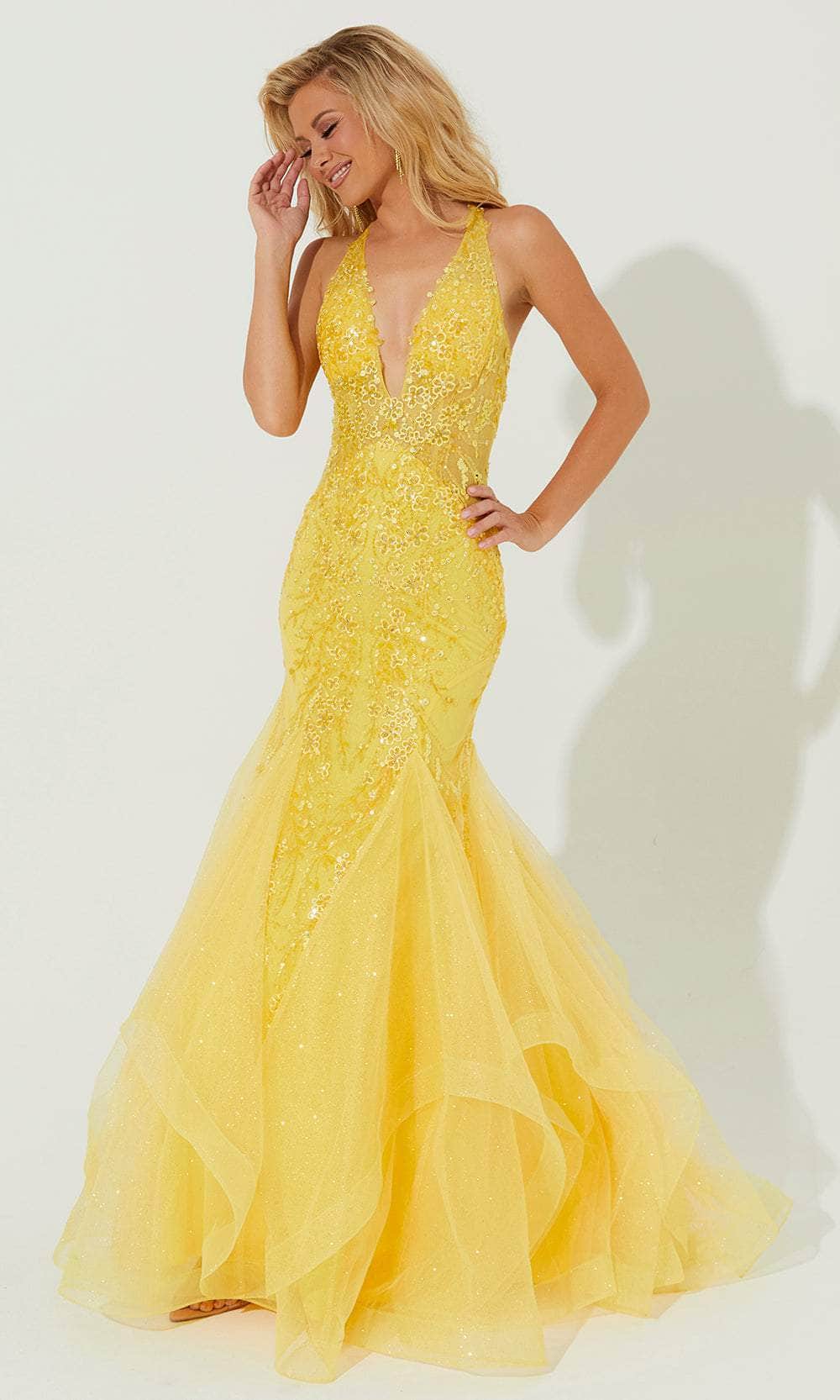 Elegance is redefined in Jasz Couture 7571, a gown adorned with intricate floral appliques that exude timeless charm. The sleeveless fitted bodice complements a plunging neckline, while strappy details adorn the open back, creating a modern allure. Secured with a center zipper closure, the floor-length skirt gracefully flows in a trumpet silhouette, culminating in a sweeping train. This Jasz Couture 7571 is a harmonious blend of sophistication and contemporary style, making it a captivating choice for any special occasion. Models are wearing Hot Pink and Yellow colors.