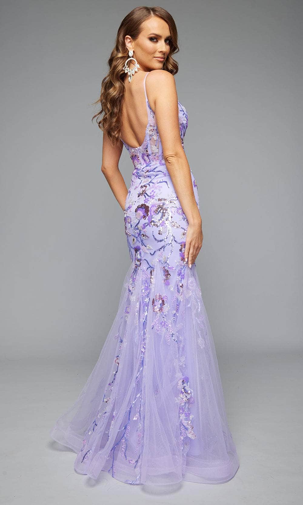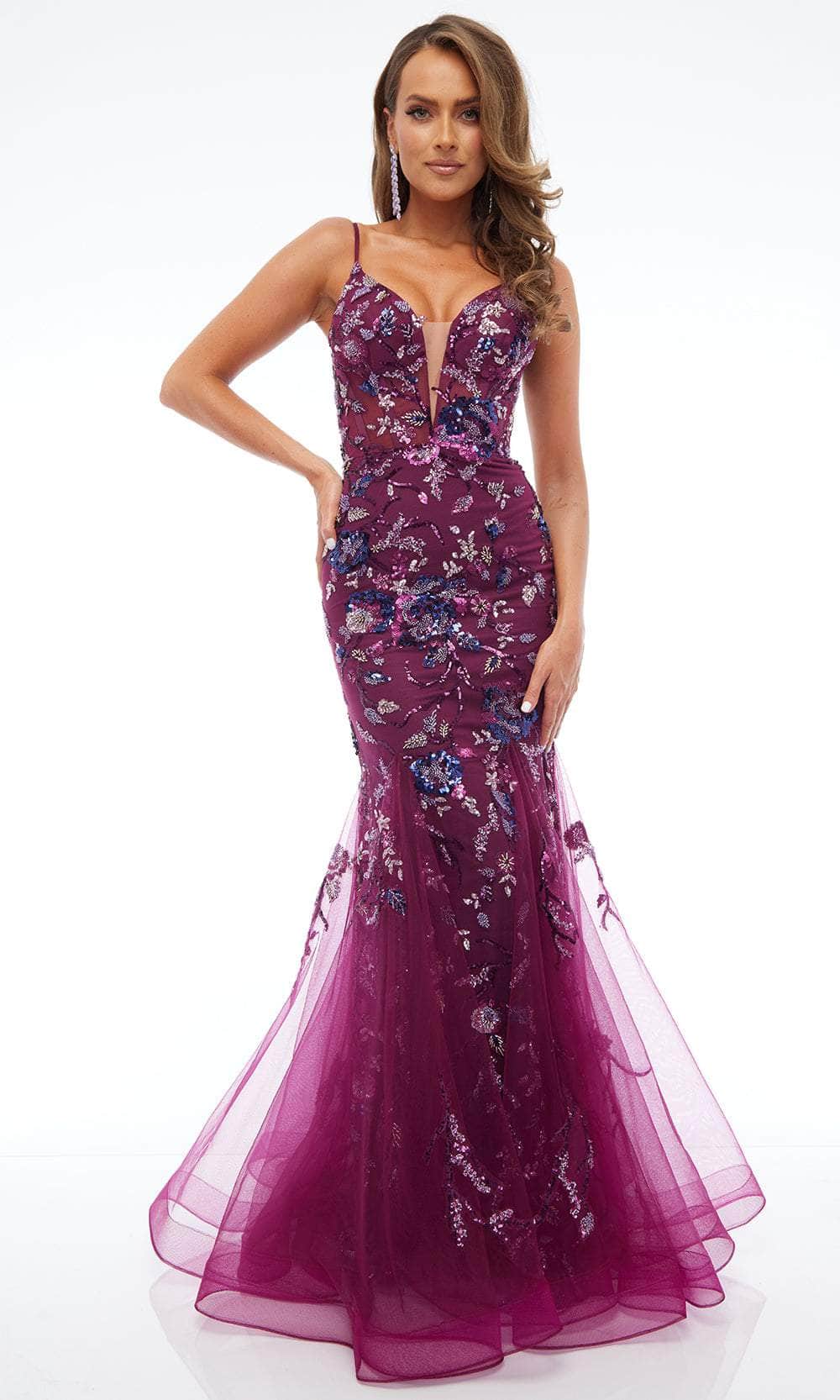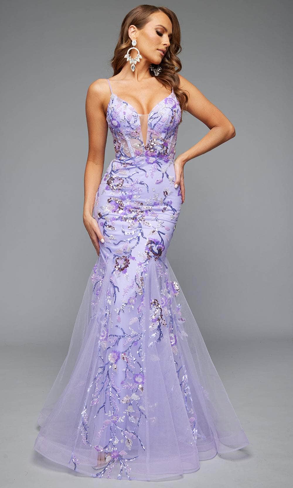 Make an enchanting entrance in the Jasz Couture 7619, a breathtaking mermaid gown adorned with floral embroidery and sequins. Spaghetti straps lead to a plunging neckline, offering a sultry yet elegant touch. The fitted bodice accentuates curves, while the sheer tulle fabric enhances the dress ethereal appeal. The mermaid skirt flares beautifully at the bottom, adding drama to every step. Perfect for prom or evening events, the Jasz Couture 7619 ensures you captivate with timeless elegance. Models are wearing Green, Lilac, and Wine colors.