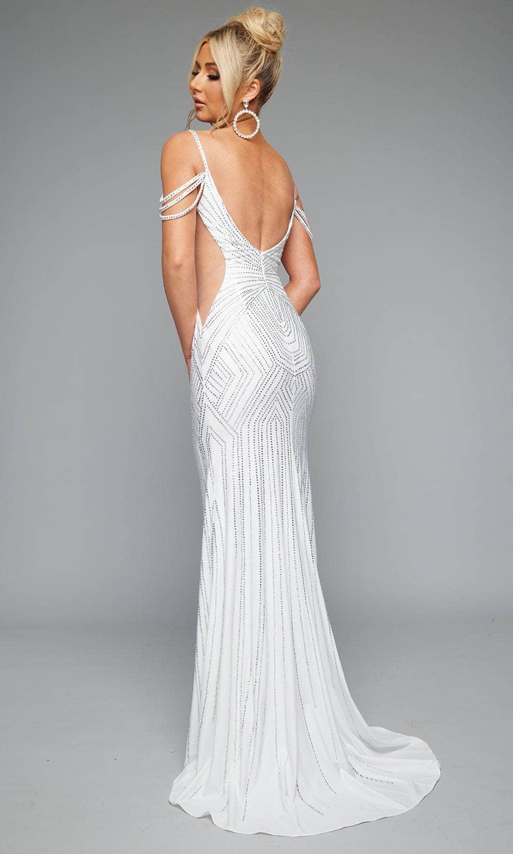 Elevate your evening look with the Jasz Couture 7642, a breathtaking mesh sheath gown. Adorned with intricate beaded embellishments, this gown features 3 off-the-shoulder straps that add a regal touch. The illusion side cutouts enhance the waist while the open back adds an alluring detail. A high slit completes the design, making it perfect for showcasing confidence and style. Make a bold statement at your next event with the Jasz Couture 7642. Models are wearing Black, and White colors.