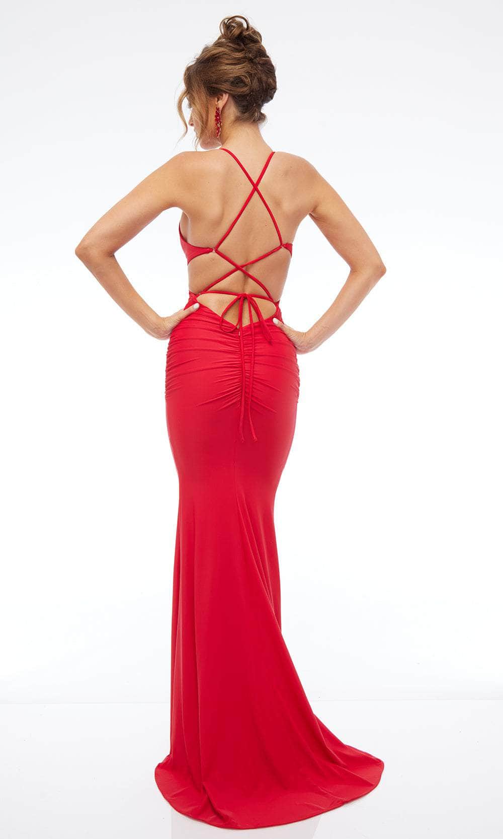 Step into the spotlight with the Jasz Couture 7683, an elegant prom dress that seamlessly blends modern and classic elements. Featuring an exquisite deep v-neckline with strappy lace-up back detailing, this gown offers a captivating appeal. The strategically placed cutouts and crisscross ruched details enhance its contemporary charm, while the spaghetti straps provide refined support. Whether you are attending prom or a gala, the Jasz Couture 7683 is sure to turn heads and make you feel like queen. Model is wearing Red color.