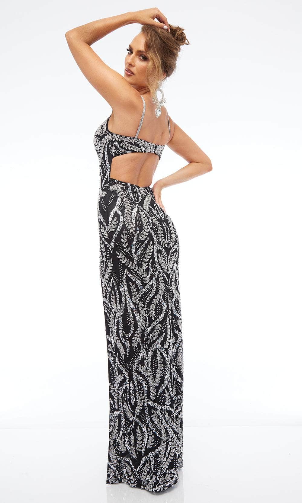 Jasz Couture 7691 is the perfect fusion of sleek sophistication and dazzling embellishments. This gown is adorned with beaded details in a mesmerizing foliage pattern, creating an enchanting look. The spaghetti straps add a delicate touch while offering a secure fit, leading to a captivating cutout back that adds just the right amount of drama. A thigh-high slit elevate the elegant column skirt, allowing for fluid movement and a bold statement. Embrace elegance and confidence with Jasz Couture 7691. Model is wearing Black/Silver color.