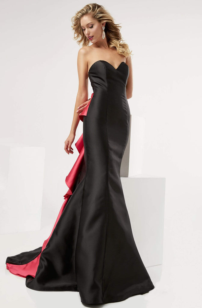 Feel and live like a million bucks as the crowd follows your every sway in this spectacular Jasz Couture 5978 creation. Glamorously seam-sculpted as you flaunt your decolletage, this stunning piece shows a strapless sweetheart neckline and an alluring open back with bandeau strapped cutout design. Radiantly embellished with an exquisitely ruffled back panel in a contrasting color, the elegant mermaid skirt contours divinely along every curve and flares down to a sweep of train. Strut like a celebrity every single time in this upscale Jasz Couture masterpiece. Model is wearing the Black/Fuchsia color. Find more White Dresses for Women.