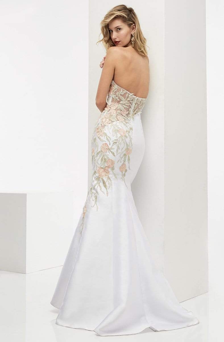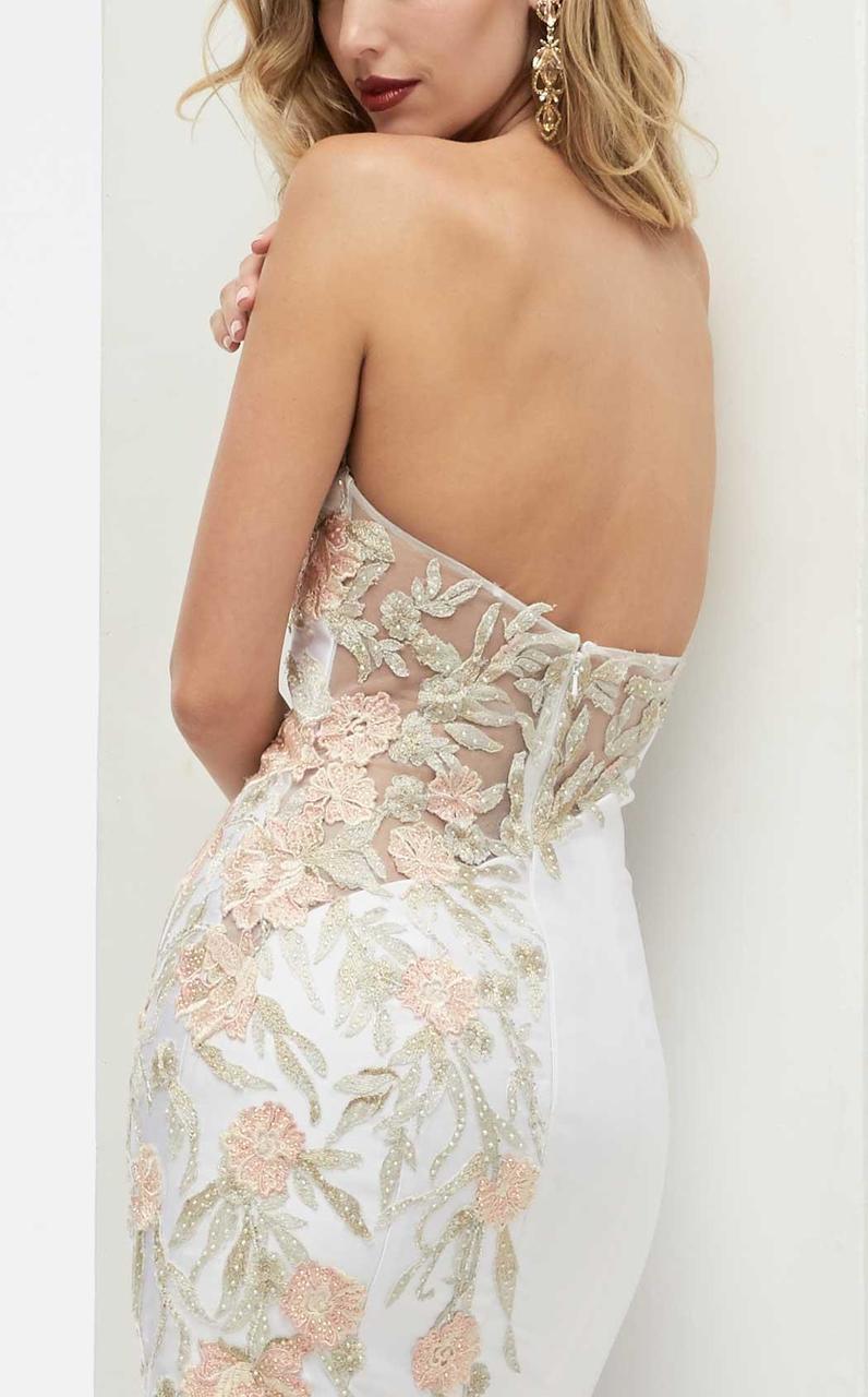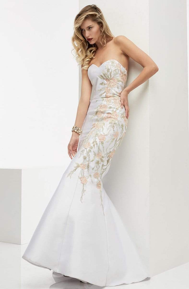 Flaunt your figure in this captivating mermaid evening gown by Jasz Couture 5997. The strapless bodice has a classic sweetheart neckline and elegant open back for a sophisticated and fabulous style. This fresh ensemble features fantastic floral adornments and twinkling beaded accents that sparkle and shine to the glamorous full-length mermaid silhouette hem. Turn yourself into a timeless beautiful goddess in this creation by Jasz Couture. Model is wearing white multicolor ensemble.