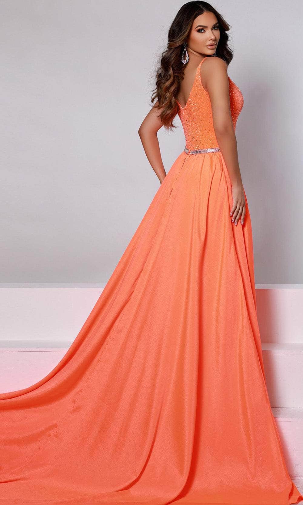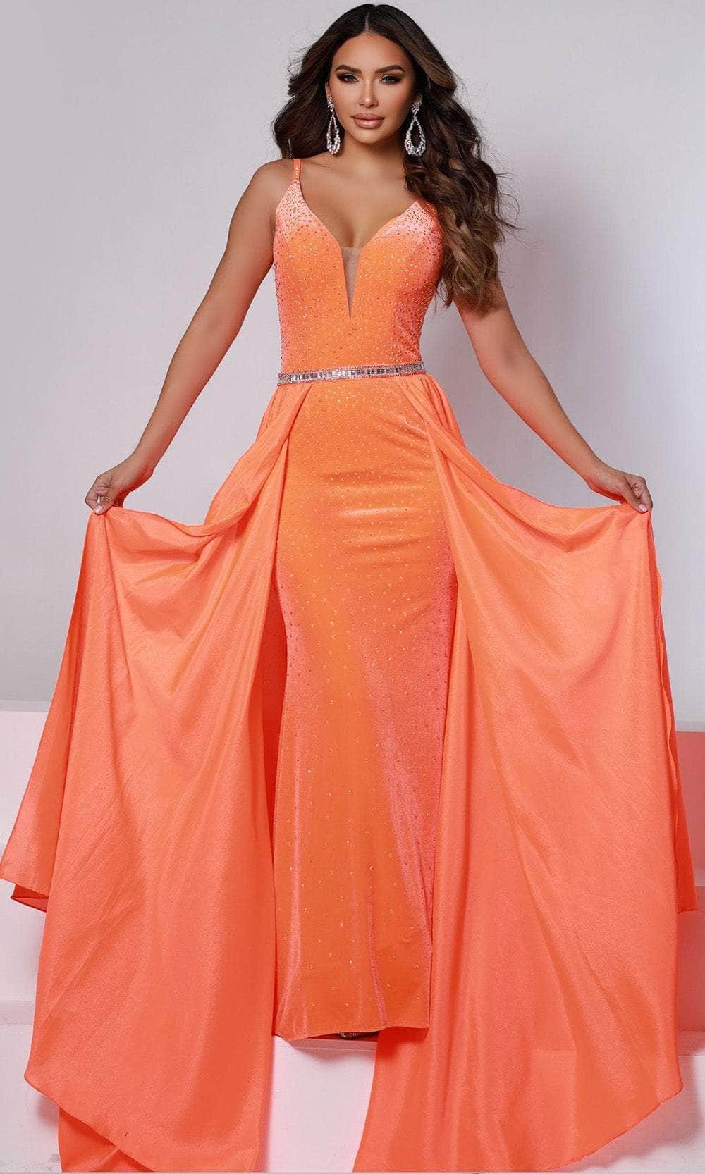 Make a bold statement at any event with the striking design of Jonathan Kayne 2400. This exquisite ensemble features a fitted illusion bodice with a deep V-neck, framed to perfection. The mid open back, secured with a zipper closure, adds a touch of allure and sophistication. A delicately adorned thin band, embellished with crystal beads, and an elegant overskirt elevate the dress to new levels of sophistication. Capture attention and captivate the audience by showcasing your finest assets in this alluring Jonathan Kayne 2400 creation.