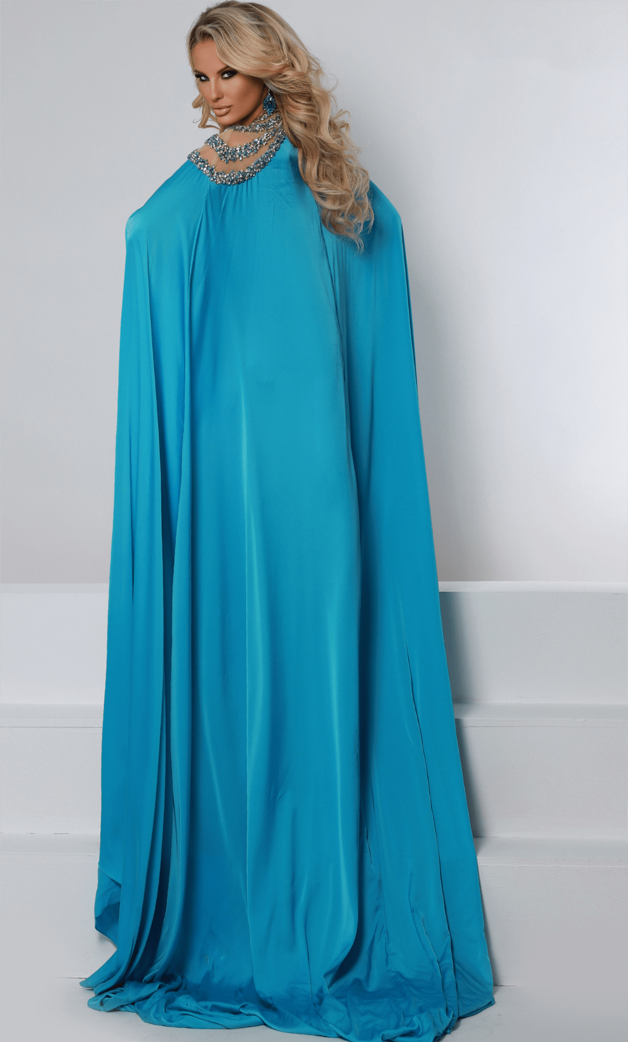 Achieve new heights of fashion in this exquisite evening gown by Johnathan Kayne 2628. Feel like a queen in this outfit beautifully festooned with intricate sequins and hand-beaded details. This attention grabbing style flaunts a jewel neckline and a long charmeuse cape streaming to the sweeping train. The sheath skirt has a sexy thigh-high slit for some flirty leg exposure and finishes with a full length hemline. Fascinate the crowd wearing this exceptional Johnathan Kayne 2628 creation. Models are wearing the Magenta and Teal colors.