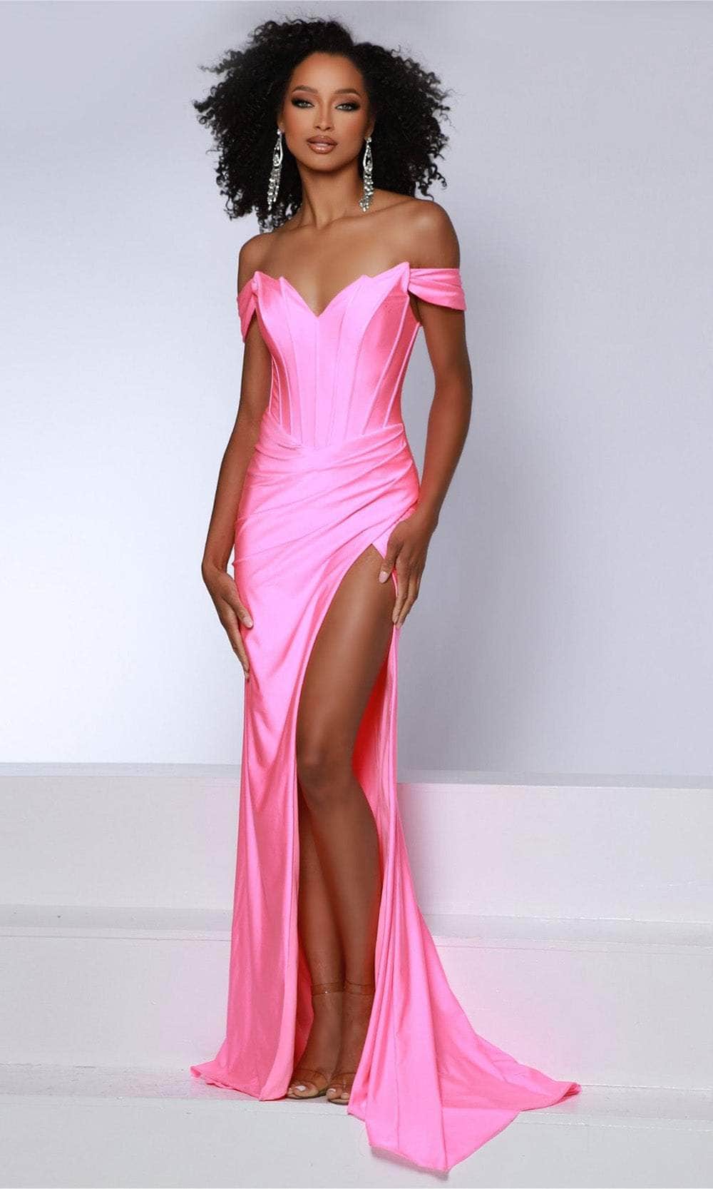 Show off your captivating character in the enduring charm of the Johnathan Kayne 2823 gown! Crafted with precision on a 4-way stretch lycra silhouette, this dress delivers a discreet yet bold message with its exposed boning on the bodice and a distinctive peak at the neckline. Modify your appearance with the removable off-the-shoulder drapes, while the skirt displays graceful draping, a bold thigh-high slit, and a trailing sweep of fabric. Bask in the spotlight with this masterful creation, the Johnathan Kayne 2823. Models are wearing the Flamingo, Royal, Black, and Red colors