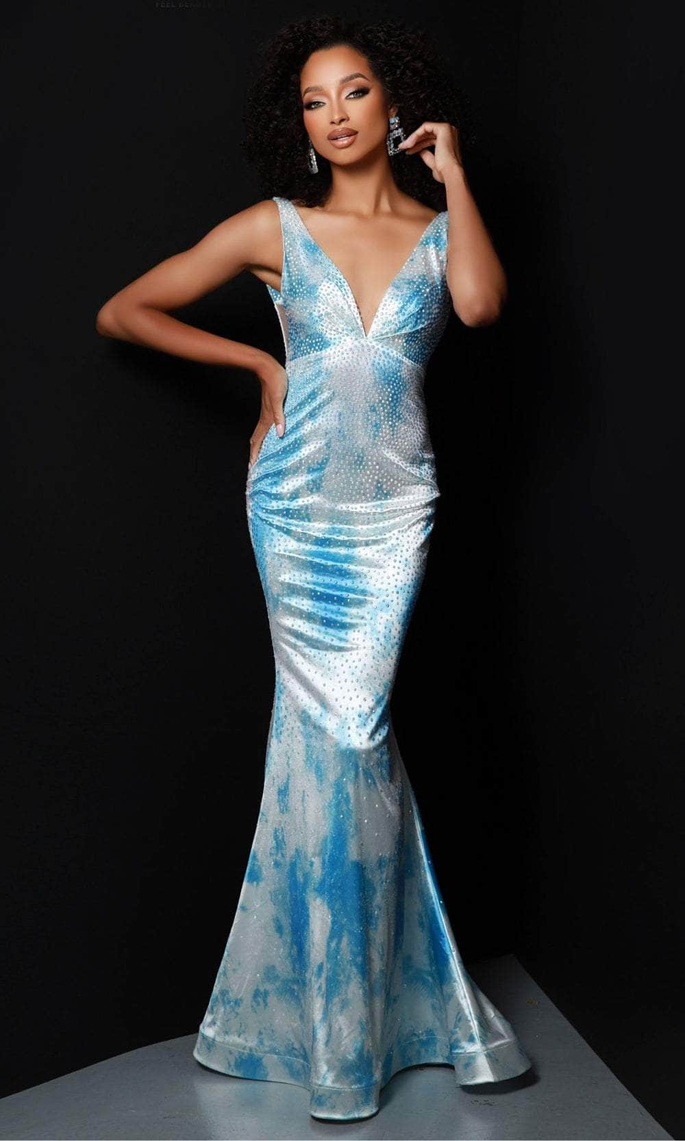 Create a special moment in Johnathan Kayne 2831 masterpiece. Crafted from printed shiny Lycra with dotted beads adornment, this sleeveless ensemble exudes feminine elegance. The wide straps highlight your shoulder, while the deep v-neckline and low v-shaped back add a touch of appeal. Ending in a horsehair hem, the full-length skirt effortlessly flares out, creating a mesmerizing mermaid silhouette This Johnathan Kayne 2831 dress is perfect for a standout style and flawless fit. Models are wearing Blue Sky, and Peaches-Cream colors.