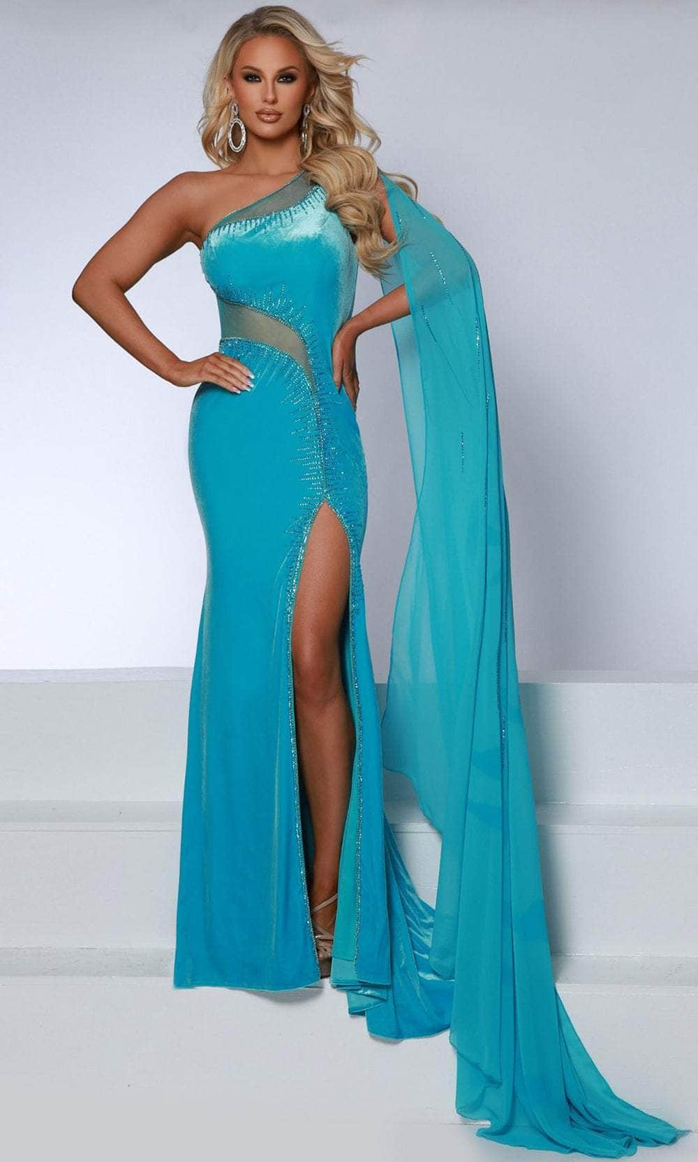 Unleash your inner goddess in this Johnathan Kayne 2861 masterpiece. This sleeveless dress boasts a glamorous one-shoulder style, adorned with sparkly beads for a touch of luxury. The detachable shoulder cape adds a unique twist and drama, letting you customize your look. It also features an asymmetrical neckline, sheer side cutouts, and an enticing cutout back. Your legs will appear gorgeous as they peek out from the side thigh-high slit. The skirt is tailored in a sheath silhouette and ends with a sweeping train that elegantly follows from behind. This Johnathan Kayne 2861 dress is designed to give you a very remarkable experience. Models are wearing Aqua, Black, and Red colors.