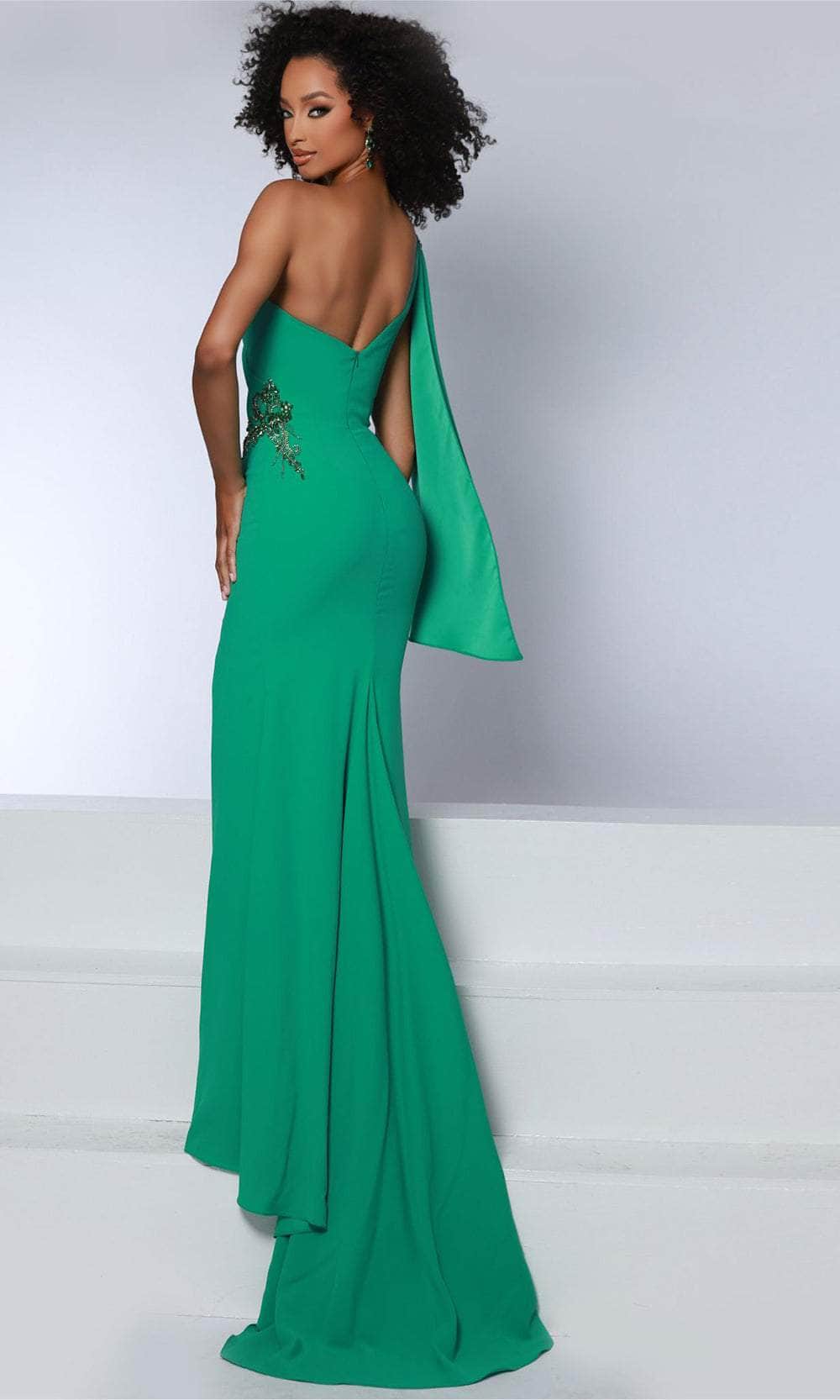 Elegantly descend the limelight in the captivating design of Johnathan Kayne 2864. Crafted from stretch crepe, this gown showcases a single shoulder neckline accompanied by a graceful cape sleeve. The bodice, adorned with exquisite crystal embellishments, exudes opulence. The sheath skirt features a side slit, adding allure to the ensemble, and concludes with a sweeping train. Johnathan Kayne 2864 emerges as a regal masterpiece, harmonizing style and grace with every step, making it an impeccable choice for those seeking refined sophistication on the grand stage of the red carpet. Models are wearing the Hot Pink, Kelly Green, Soft White colors