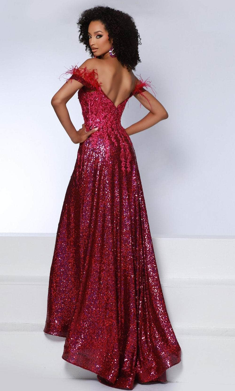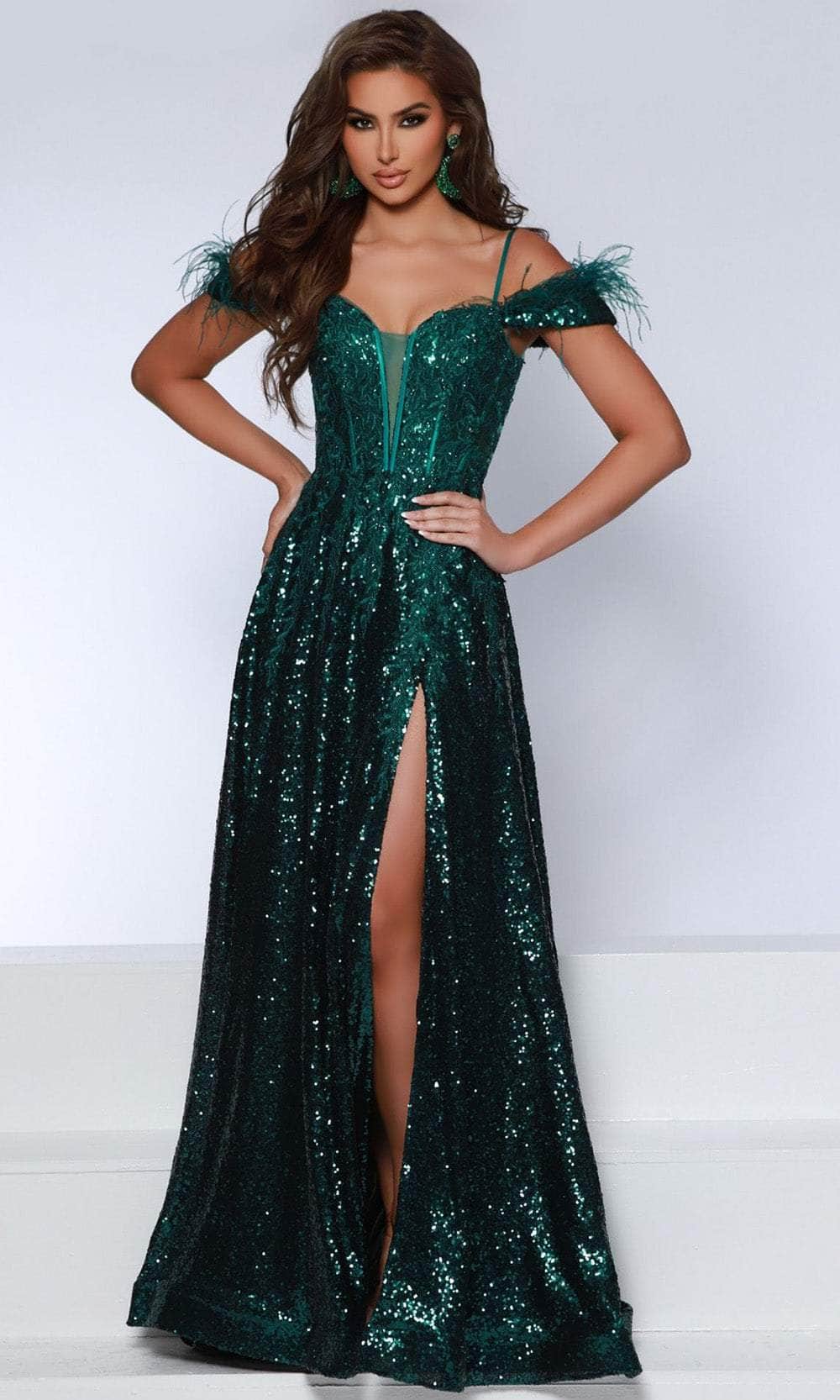Distinguish yourself as the epitome of elegance in the exquisite Johnathan Kayne 2887 masterpiece. Meticulously crafted, this gown showcases precision in its sequin-adorned bodice, accentuating lace elements and a visible corset boning. The off-shoulder neckline, adorned with delicate feathers and complemented by spaghetti straps, leads to a captivating v-open back. The A-line silhouette, featuring a daring thigh-high slit and convenient pockets, effortlessly cascades into a graceful sweep train. Surrender to the allure of this flawlessly feminine Johnathan Kayne 2887 creation, ensuring you become the captivating subject of conversation in any social setting. Models are wearing the Emerald, Fuchsia, and Royal colors